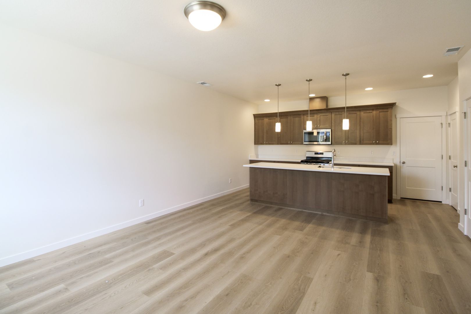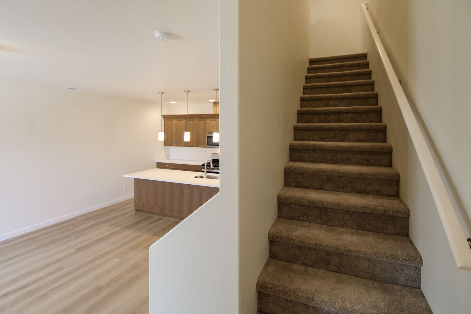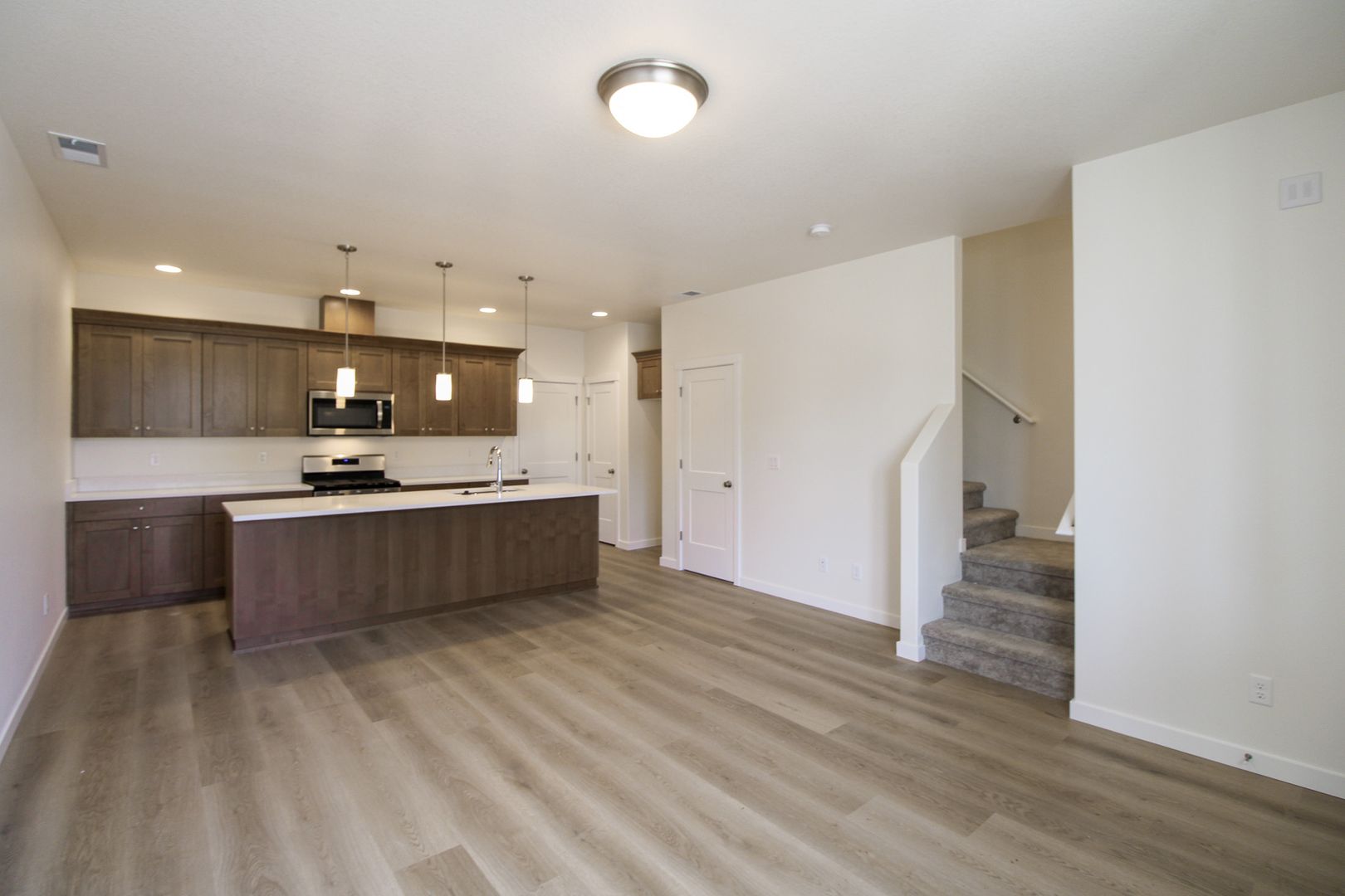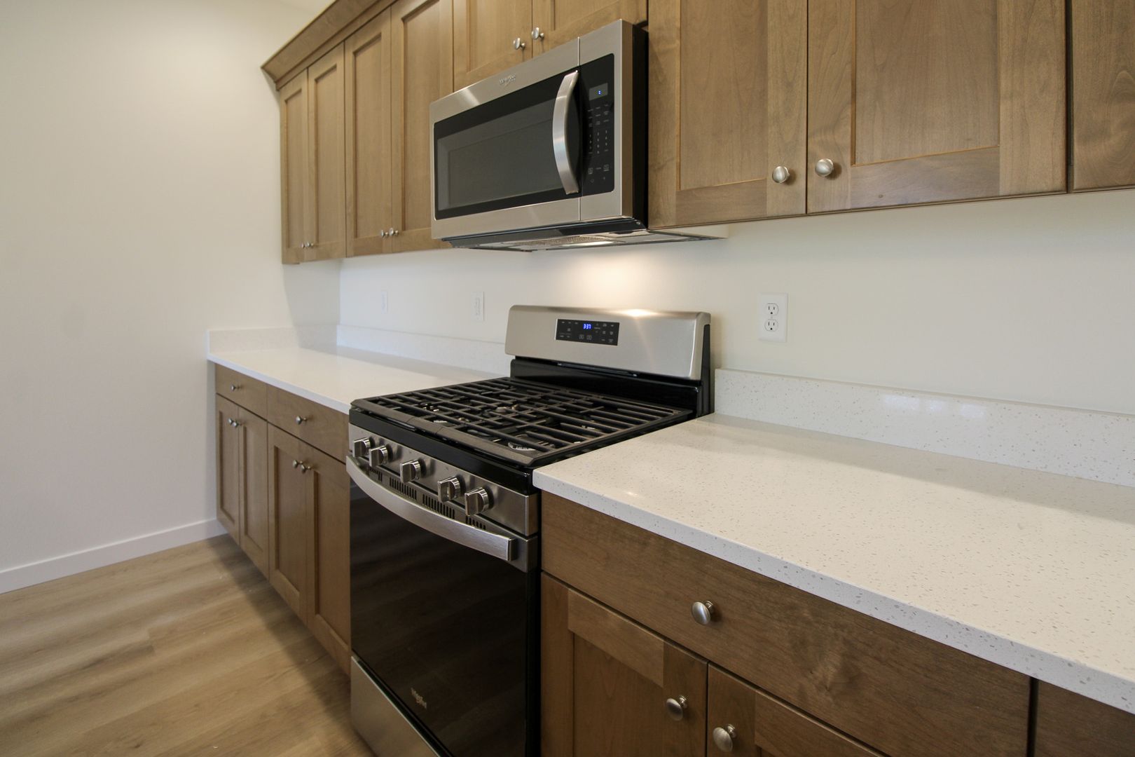 This townhome style unit features LVP flooring, stainless steel appliances (refrigerator, stove/oven, dishwasher, microwave) and quartz countertops. The living area, kitchen, and garage entrance are on the main floor. The half bathroom is located off the stairway landing. The bedrooms and full bathrooms are located upstairs. The primary bedroom has vaulted ceilings and two closets! There is a spacious closet off of the attached bathroom with a double vanity. Other features of the unit include a washer/dryer, a sliding glass door to the fenced patio area, forced air heat/AC, and an attached two car garage.