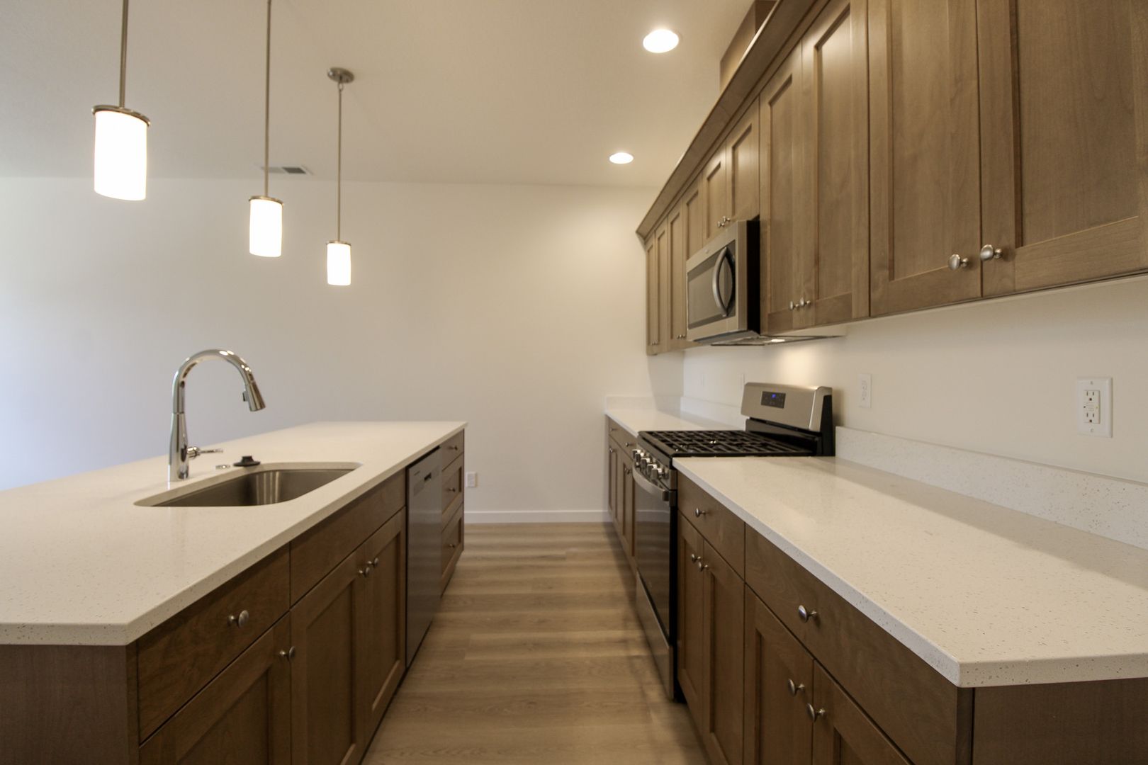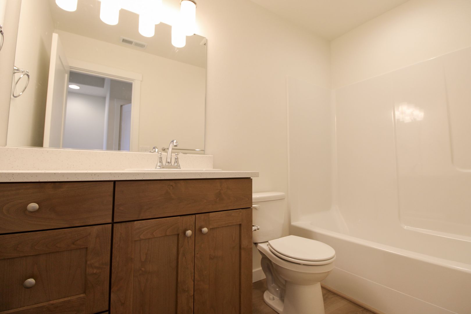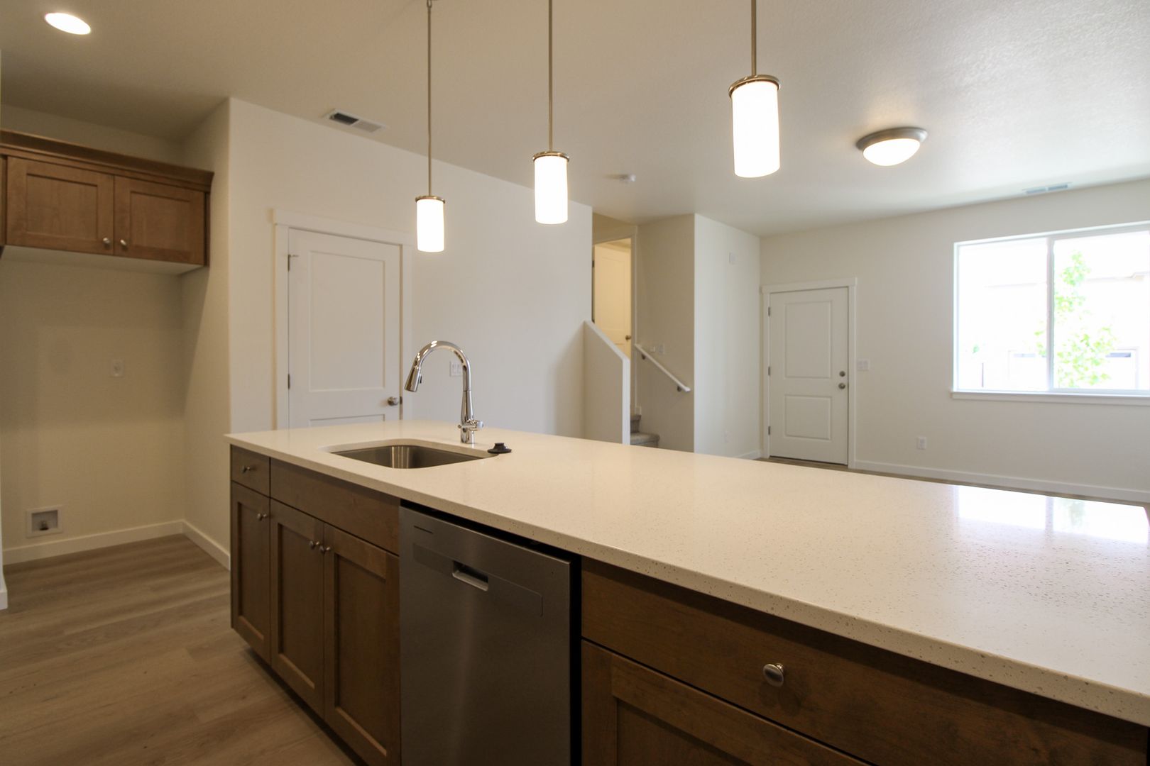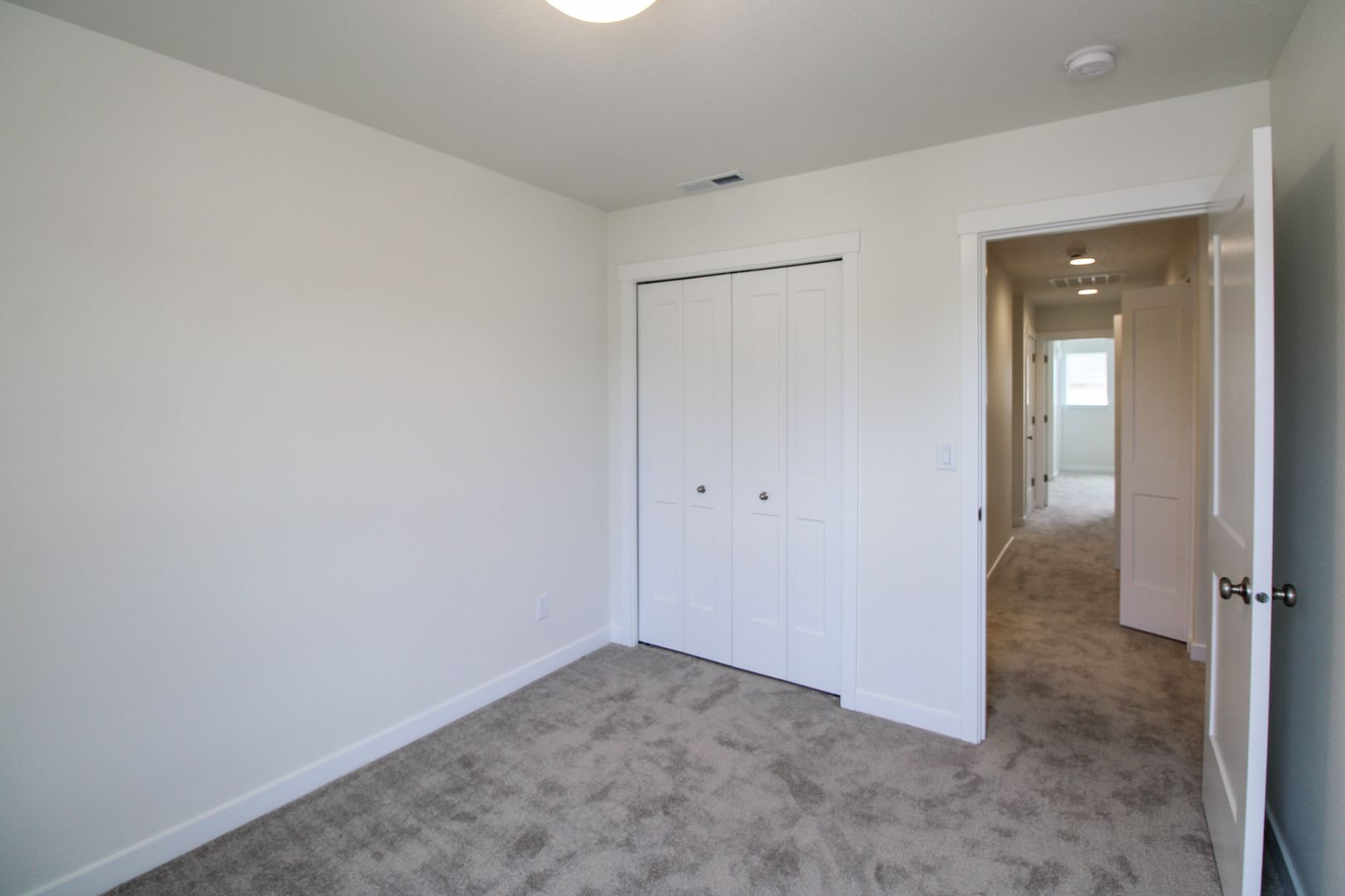 This townhome style unit features LVP flooring, stainless steel appliances (refrigerator, stove/oven, dishwasher, microwave) and quartz countertops. The living area, kitchen, and garage entrance are on the main floor. The half bathroom is located off the stairway landing. The bedrooms and full bathrooms are located upstairs. The primary bedroom has vaulted ceilings and two closets! There is a spacious closet off of the attached bathroom with a double vanity. Other features of the unit include a washer/dryer, a sliding glass door to the fenced patio area, forced air heat/AC, and an attached two car garage.
