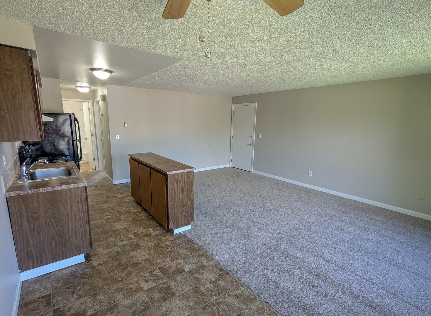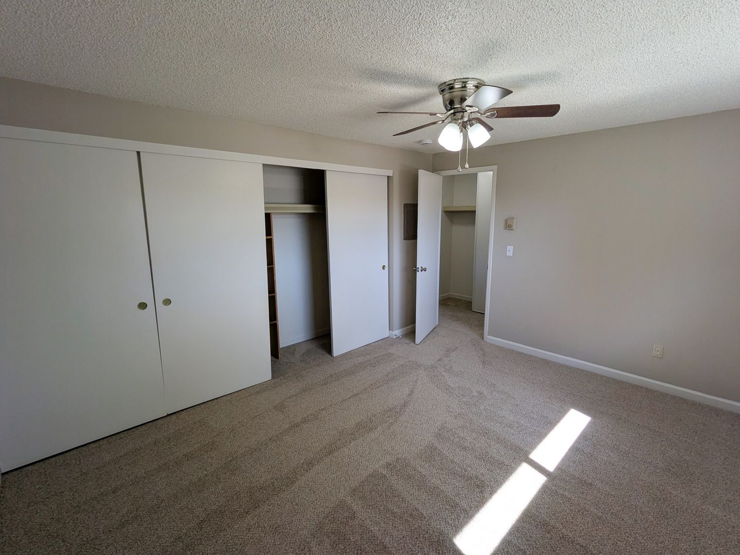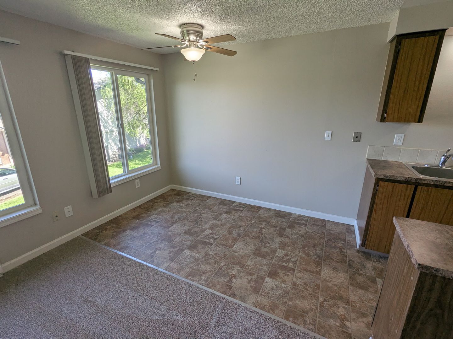 This unit features a kitchen that is equipped with a refrigerator, stove/oven, and a dining area equipped with a ceiling fan. Additional features include an open floor plan, extra storage space, on-site laundry, and on-site parking.