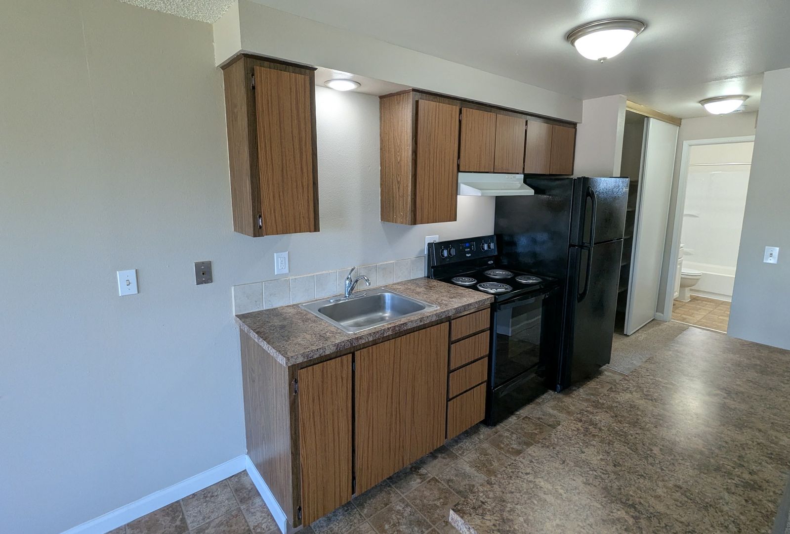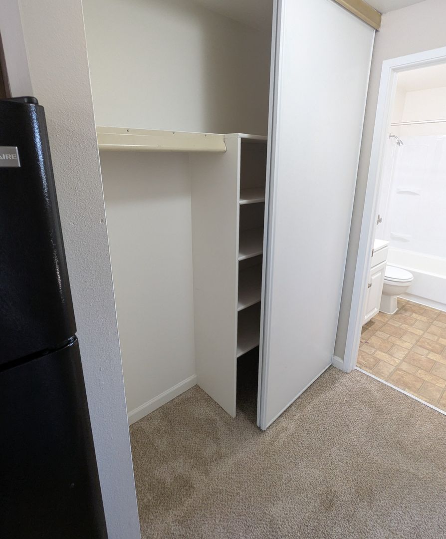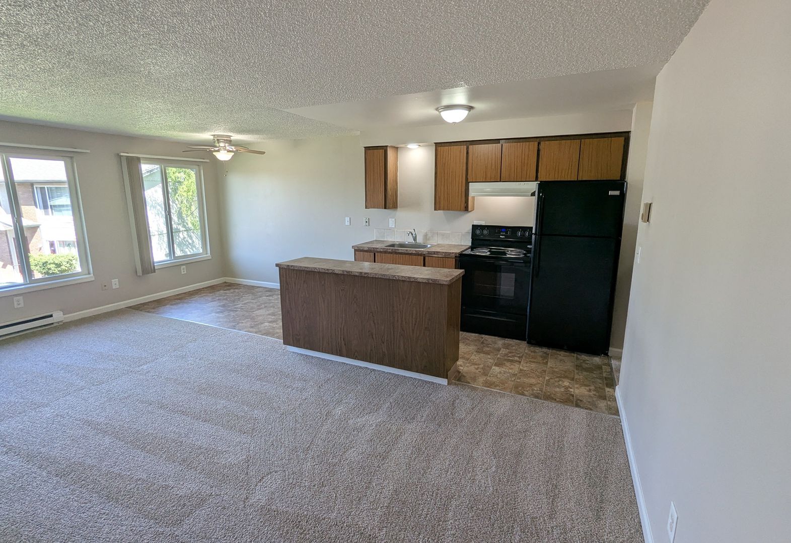 This unit features a kitchen that is equipped with a refrigerator, stove/oven, and a dining area equipped with a ceiling fan. Additional features include an open floor plan, extra storage space, on-site laundry, and on-site parking.
