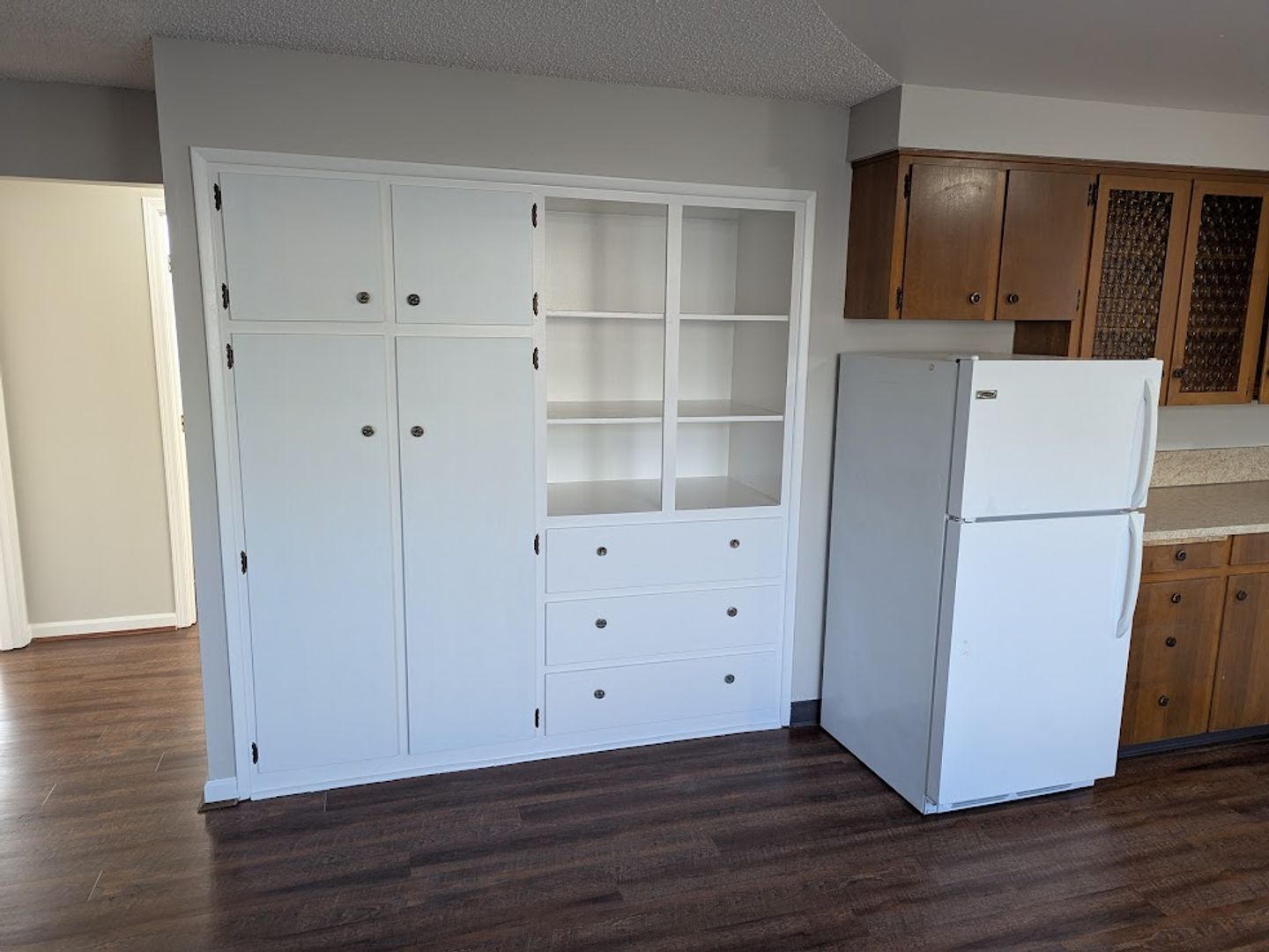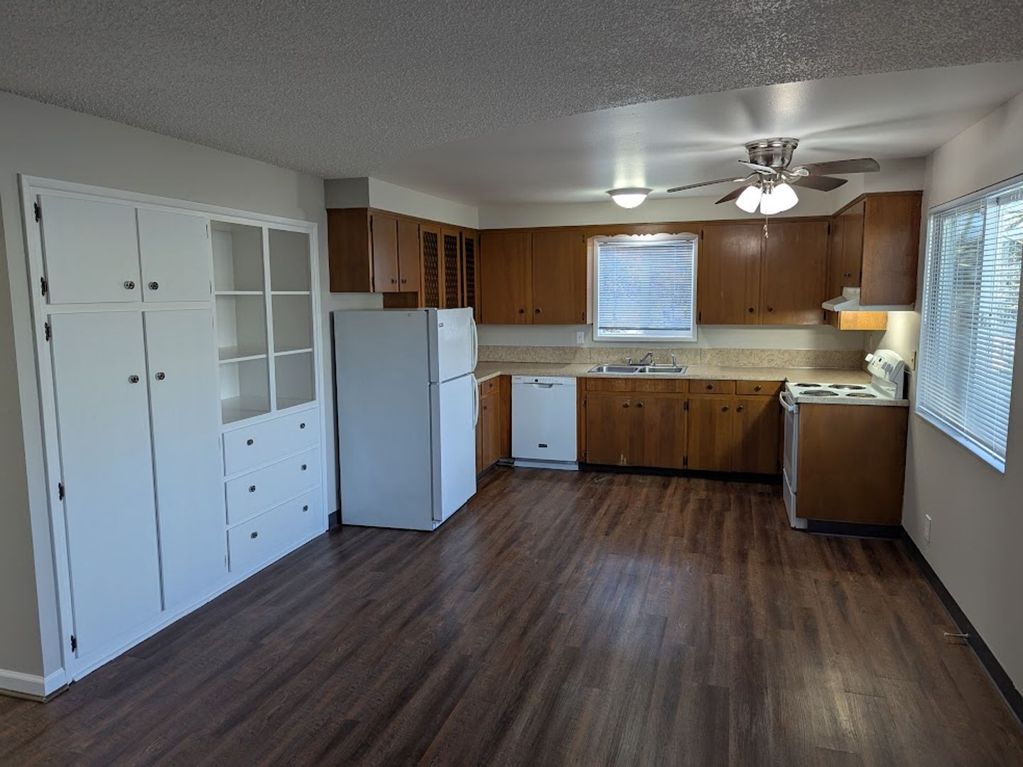 This upstairs unit features a kitchen that provides ample storage and is equipped with a refrigerator, dishwasher, double sink, and stove/oven. Additionally, the complex offers convenient onsite laundry facilities and off-street parking.