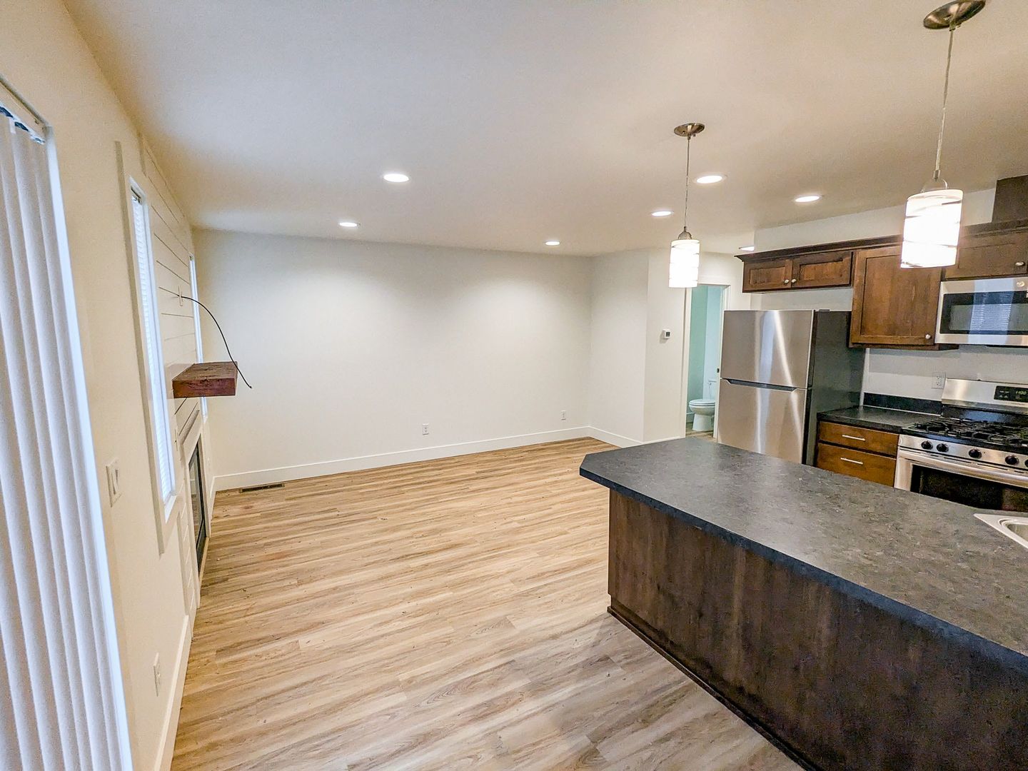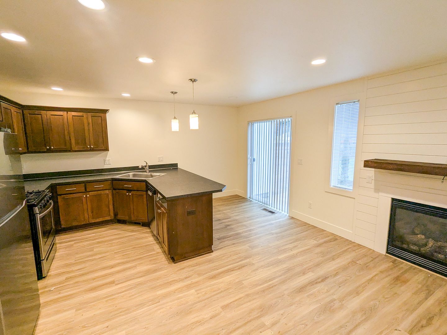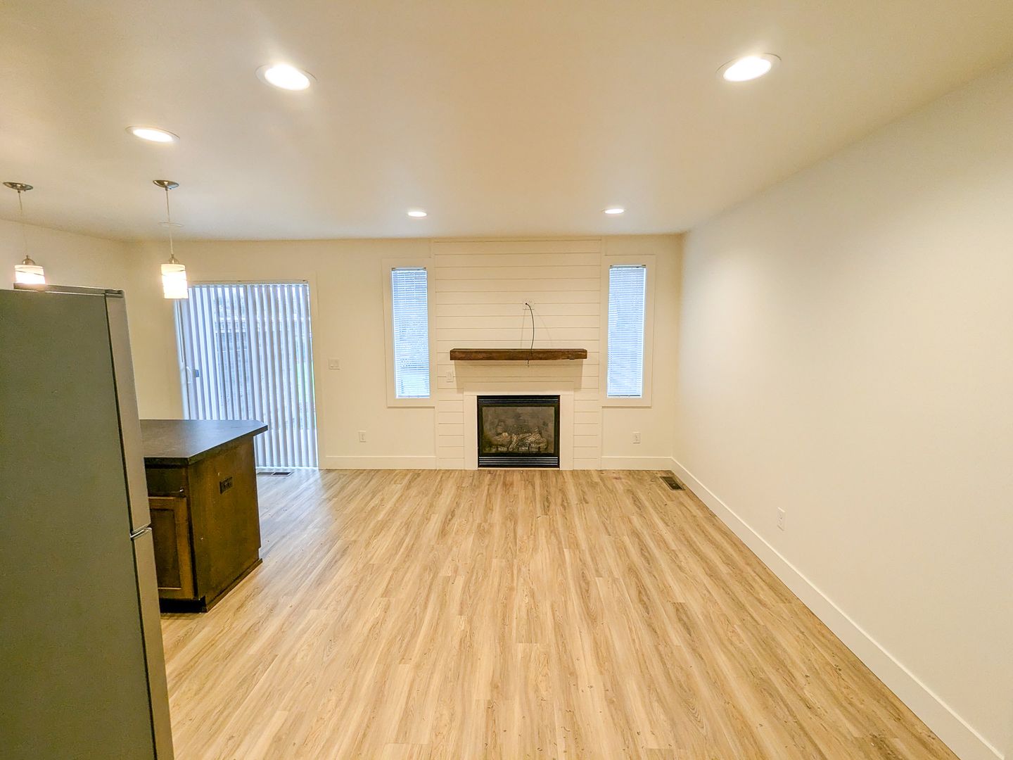 This two-story modern townhome features an open kitchen with stainless steel appliances and a gas range. The main living area includes a shiplap accent wall, gas fireplace with a barn wood mantle, and sliding glass doors leading to the patio. Additional features include washer/dryer hookups, a spacious closet, two built-in desks, and a single-car garage.