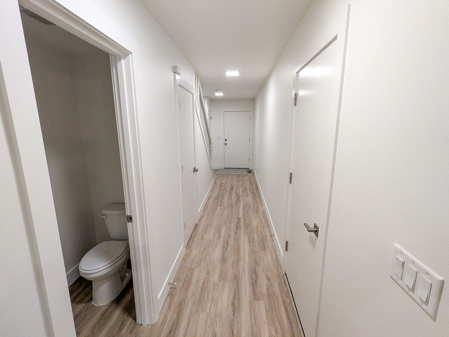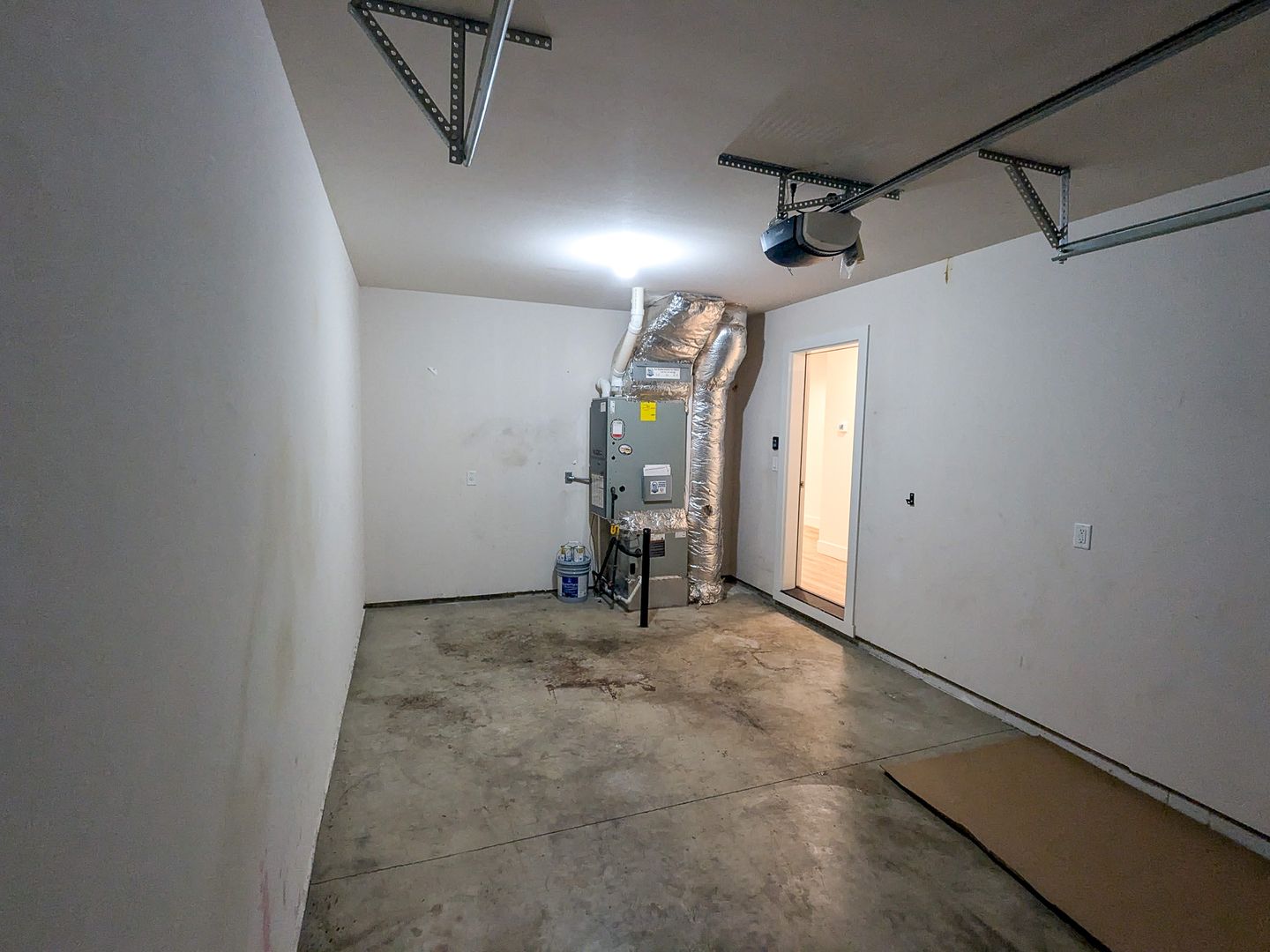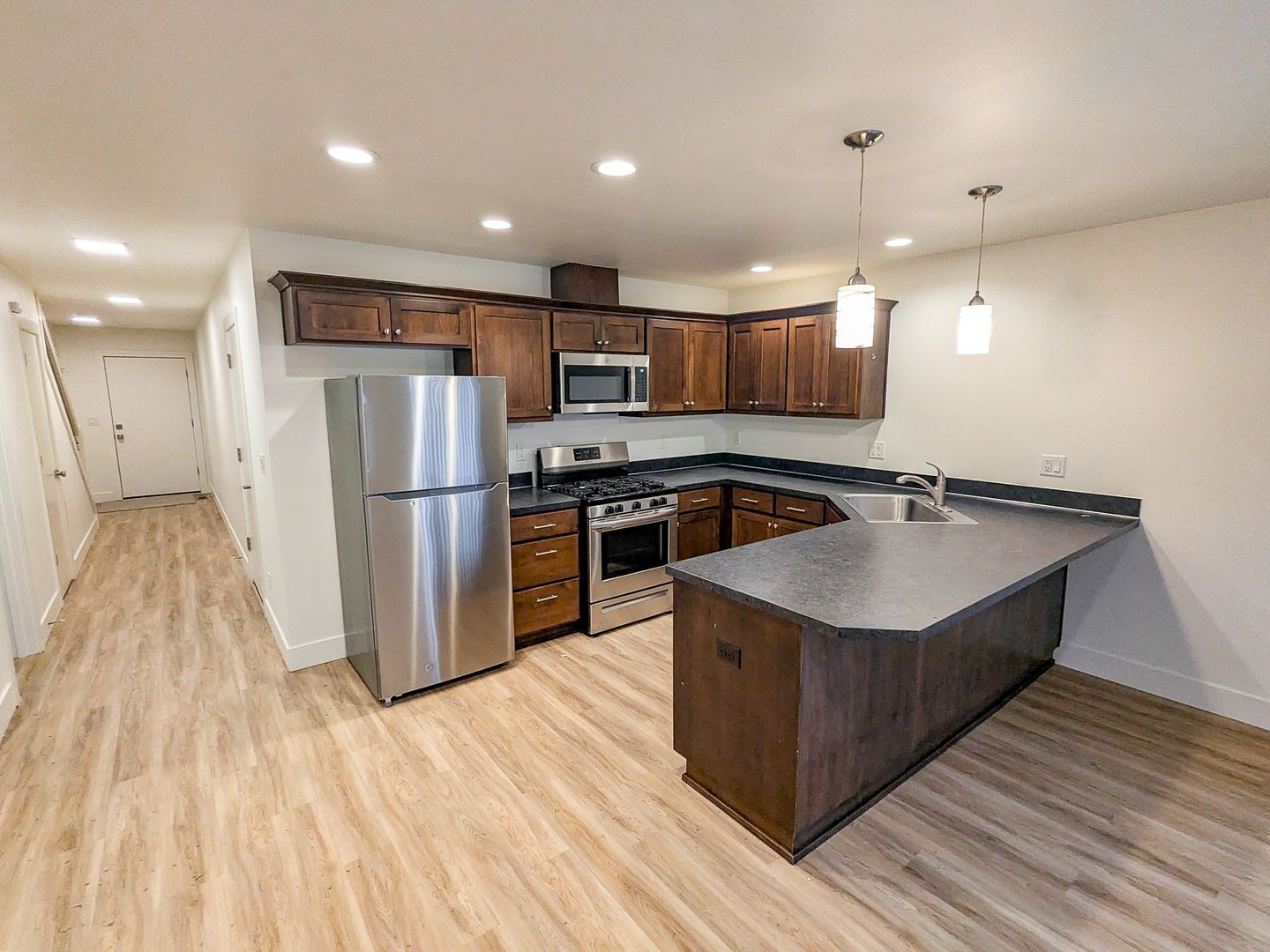 This two-story modern townhome features an open kitchen with stainless steel appliances and a gas range. The main living area includes a shiplap accent wall, gas fireplace with a barn wood mantle, and sliding glass doors leading to the patio. Additional features include washer/dryer hookups, a spacious closet, two built-in desks, and a single-car garage.