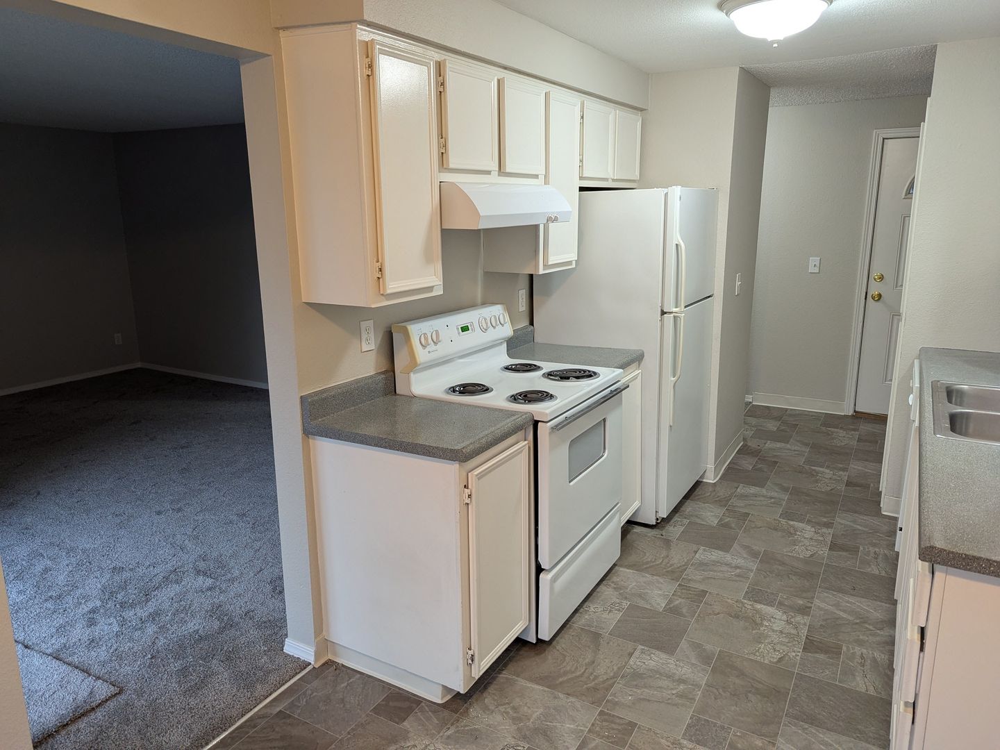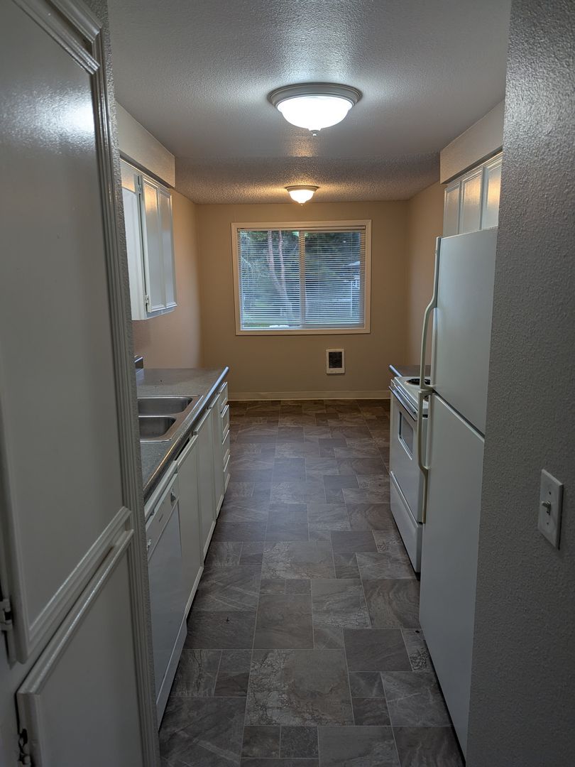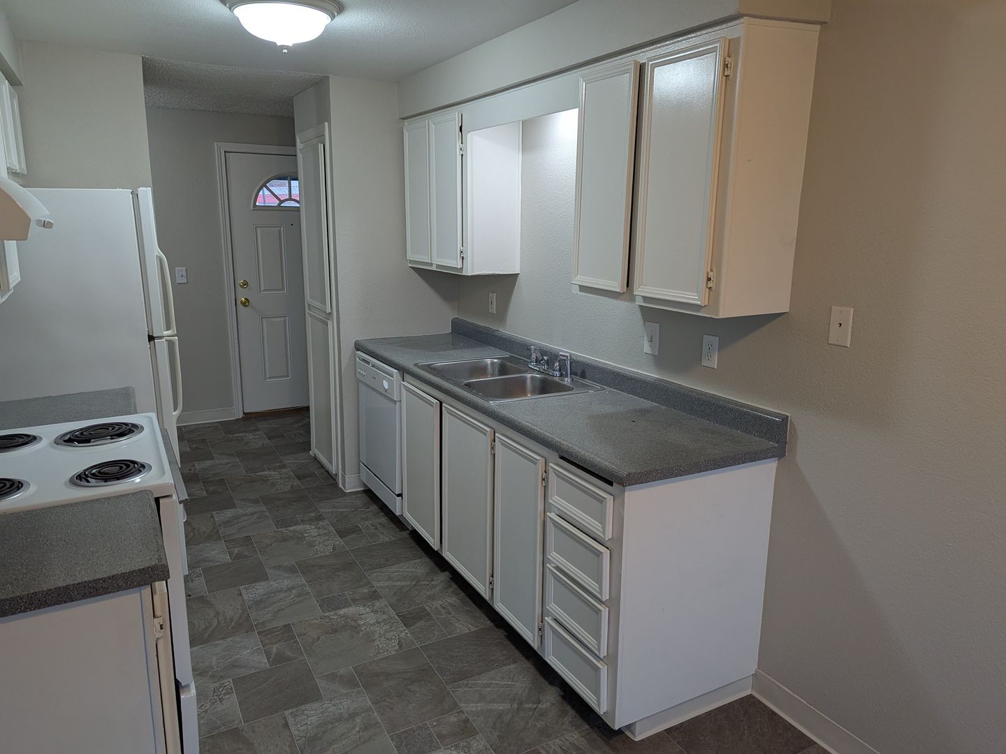 This galley style kitchen in this upstairs unit includes a dishwasher, stove/oven, and refrigerator. There is a sliding glass door to the covered back patio/balcony and 3 on-site laundry rooms.