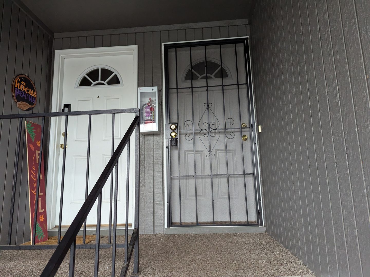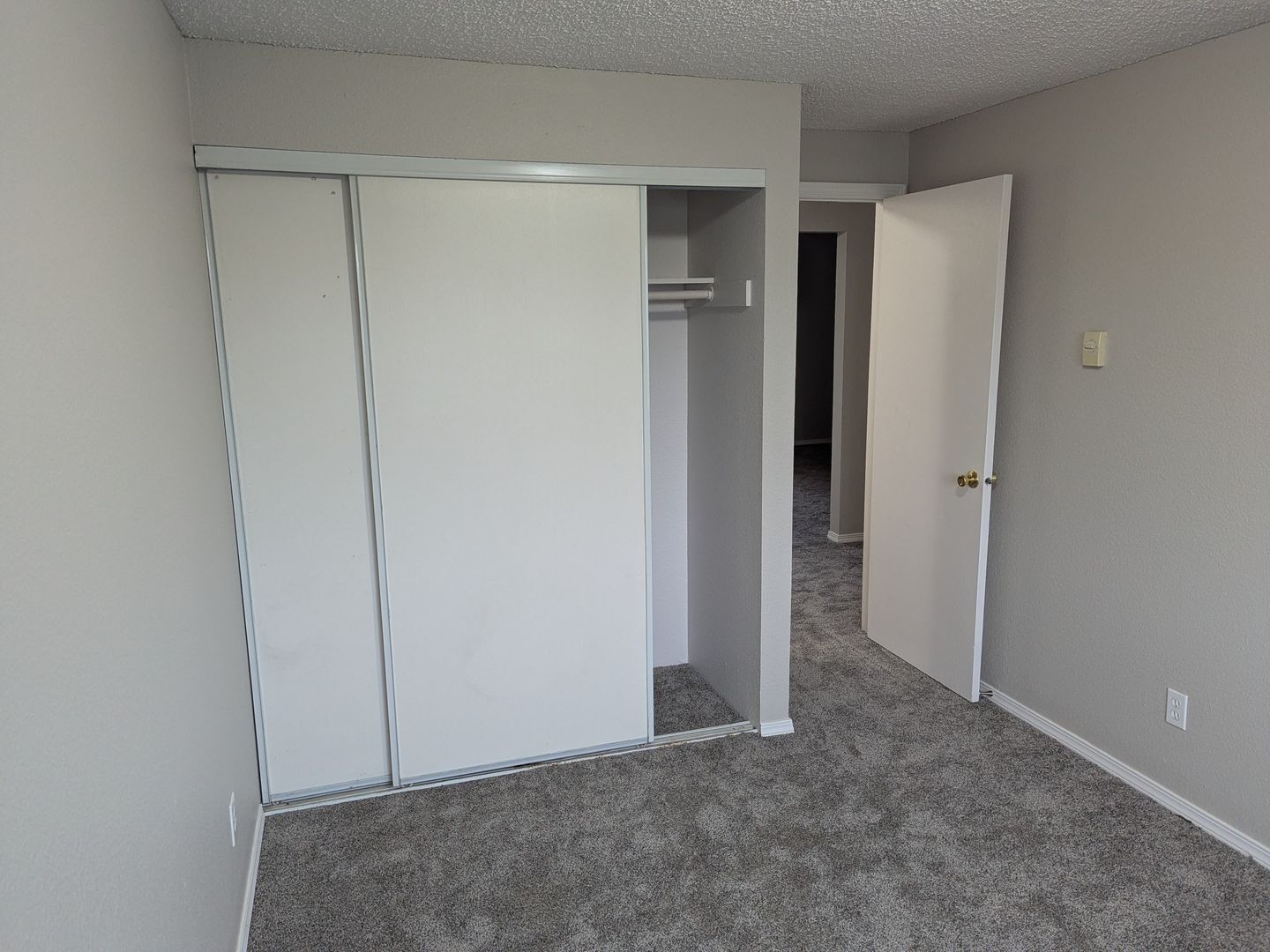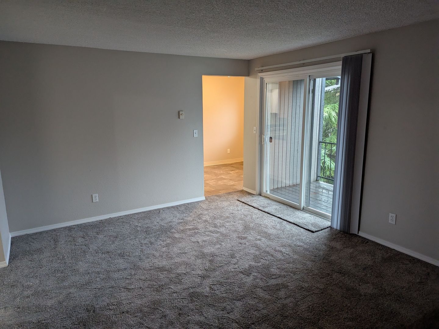 This galley style kitchen in this upstairs unit includes a dishwasher, stove/oven, and refrigerator. There is a sliding glass door to the covered back patio/balcony and 3 on-site laundry rooms.