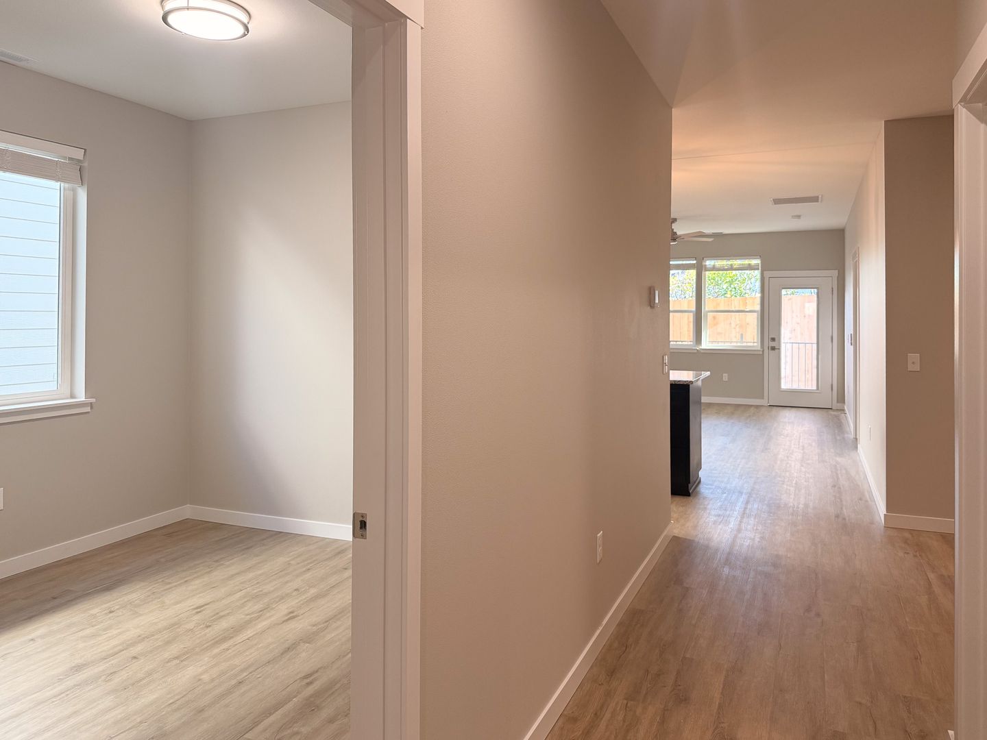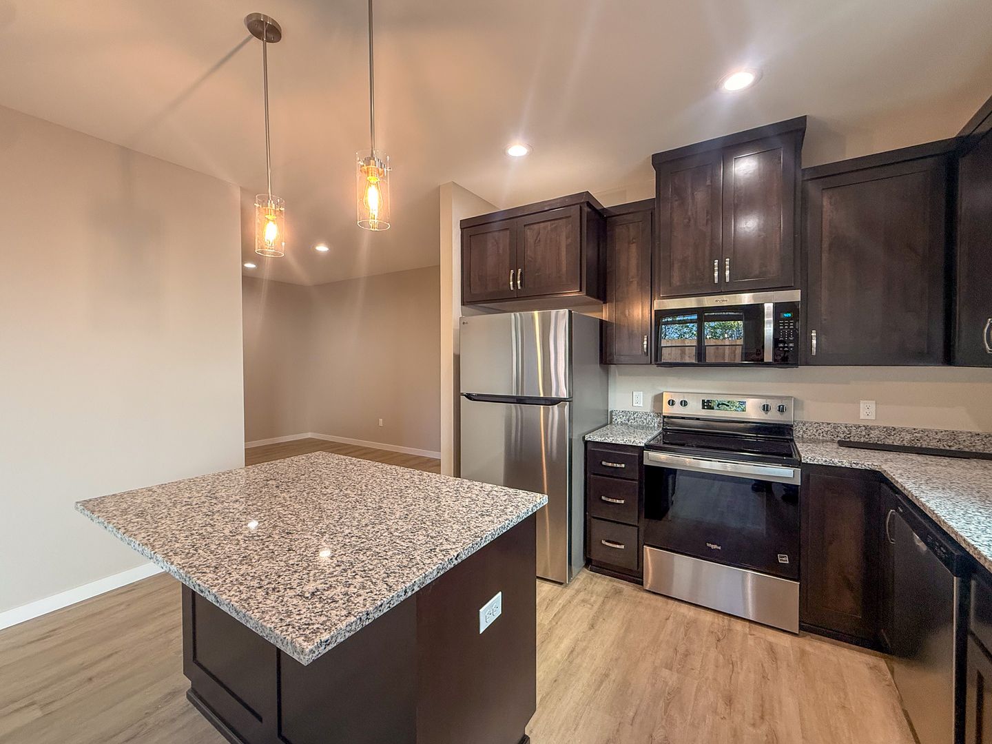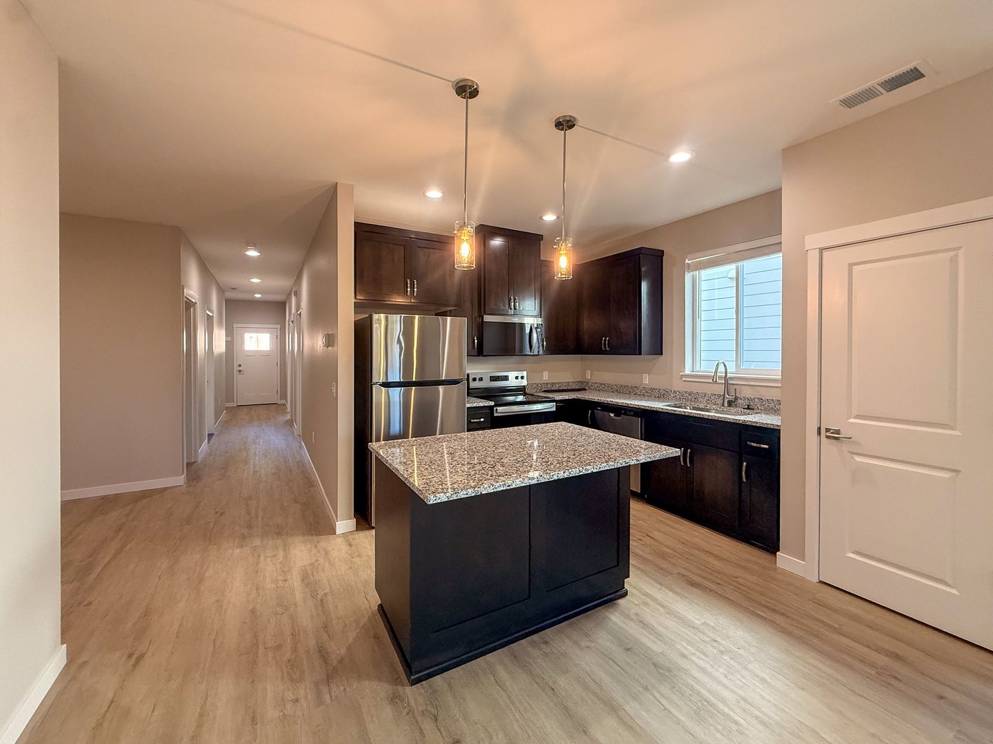 Be the first to live in this NEW CONSTRUCTION single level 4 Plex, which features a modern kitchen equipped with stainless steel appliances, including a refrigerator, stove/oven, dishwasher, and microwave, along with a convenient pantry. The spacious dining area also includes a ceiling fan for your comfort.