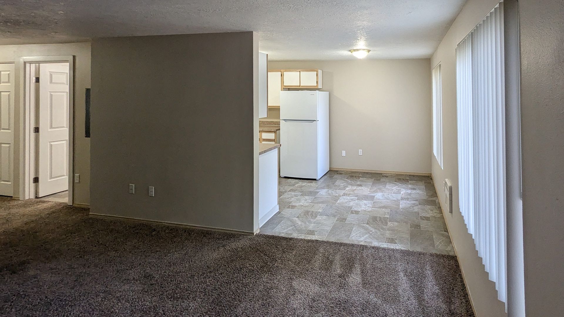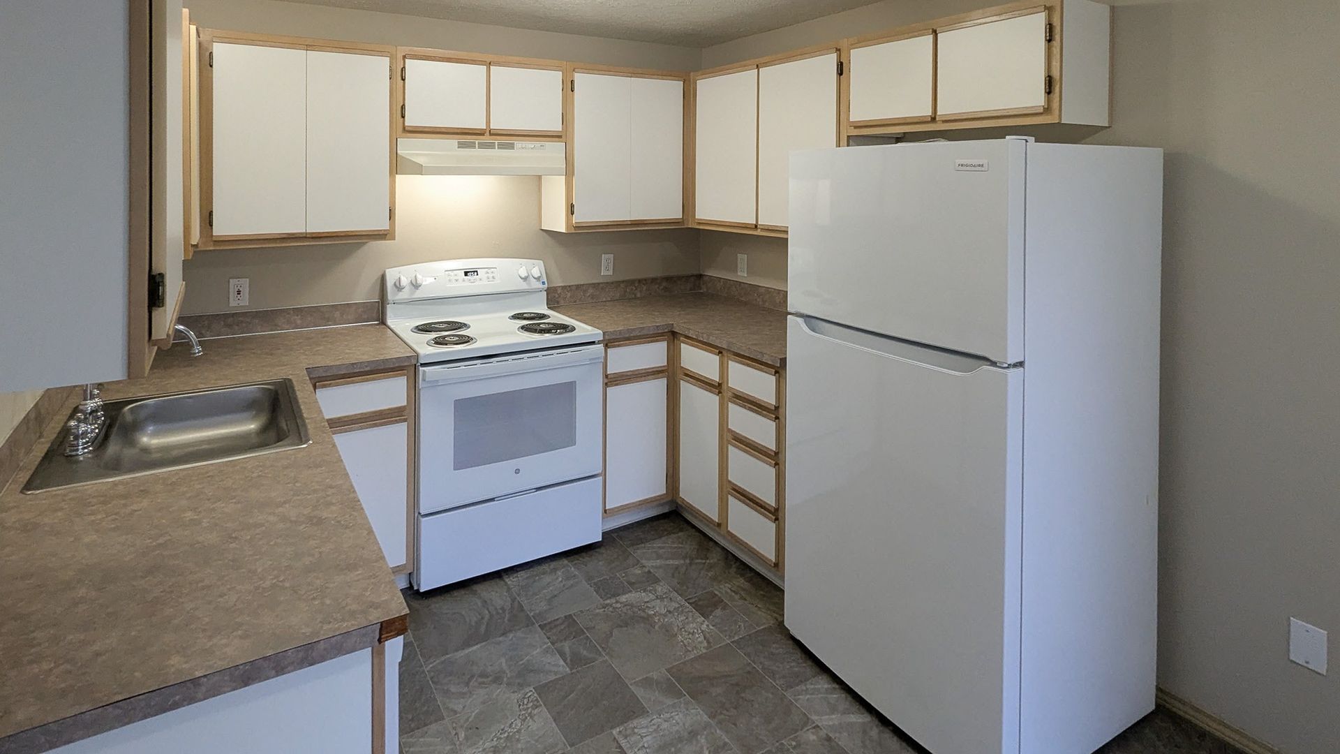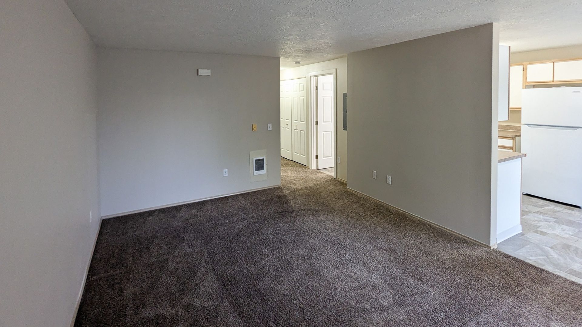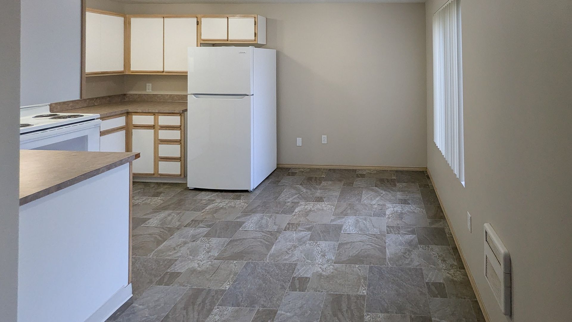 The kitchen in this downstairs unit features a stove/oven, dishwasher, and refrigerator. There is a dining area, electric wall heat, washer/dryer hookups and off-street parking.