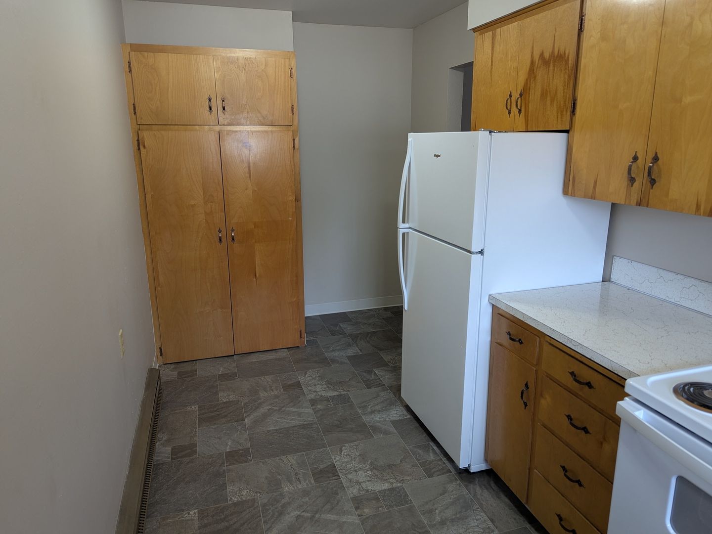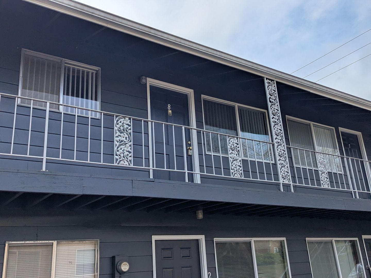 The complex has an onsite laundry room and off-street parking for one vehicle. The kitchen in this unit includes a refrigerator, stove/oven, and double sink. A sliding glass door in the living area leads to the balcony.