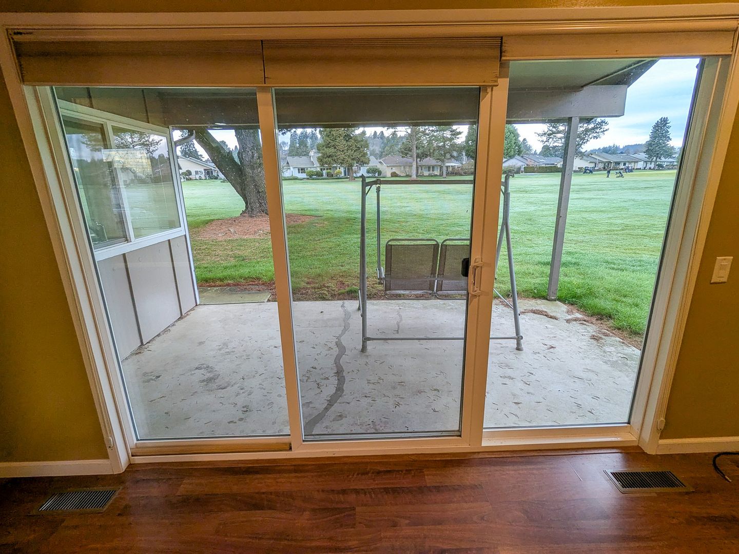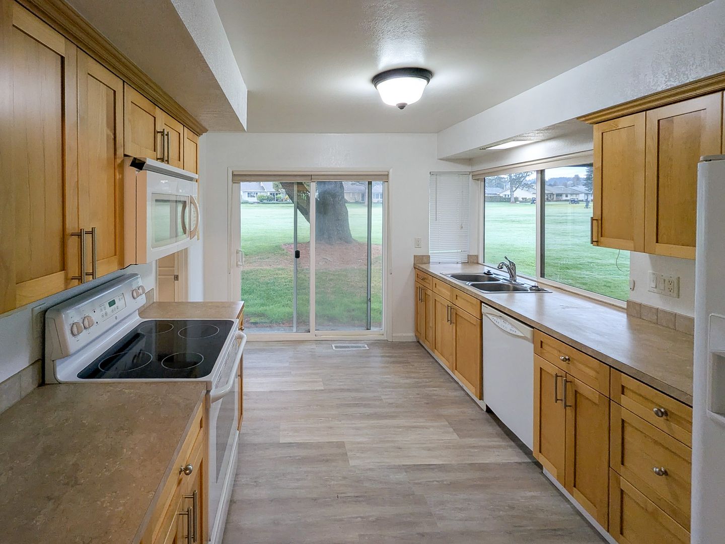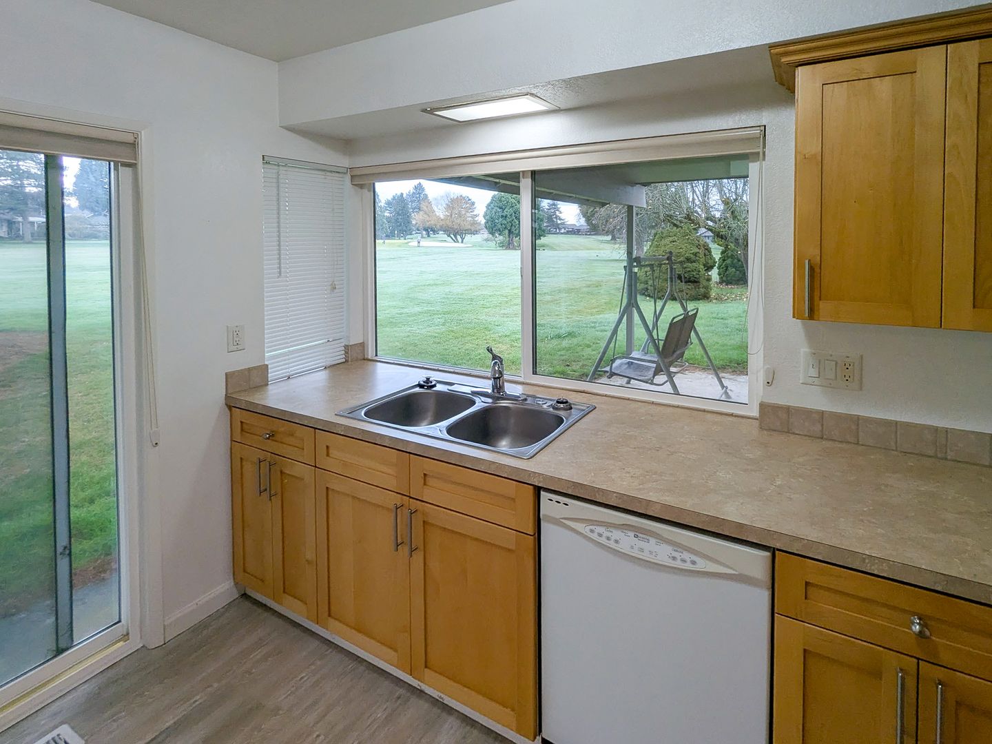 The kitchen in this home features a refrigerator, dishwasher and stove/oven. The home features a spacious patio off the large living room overlooking the golf course. Additional features of the home include gas forced air furnace, air-conditioning, washer/dryer hook-ups, covered patio in backyard, and a double attached garage.