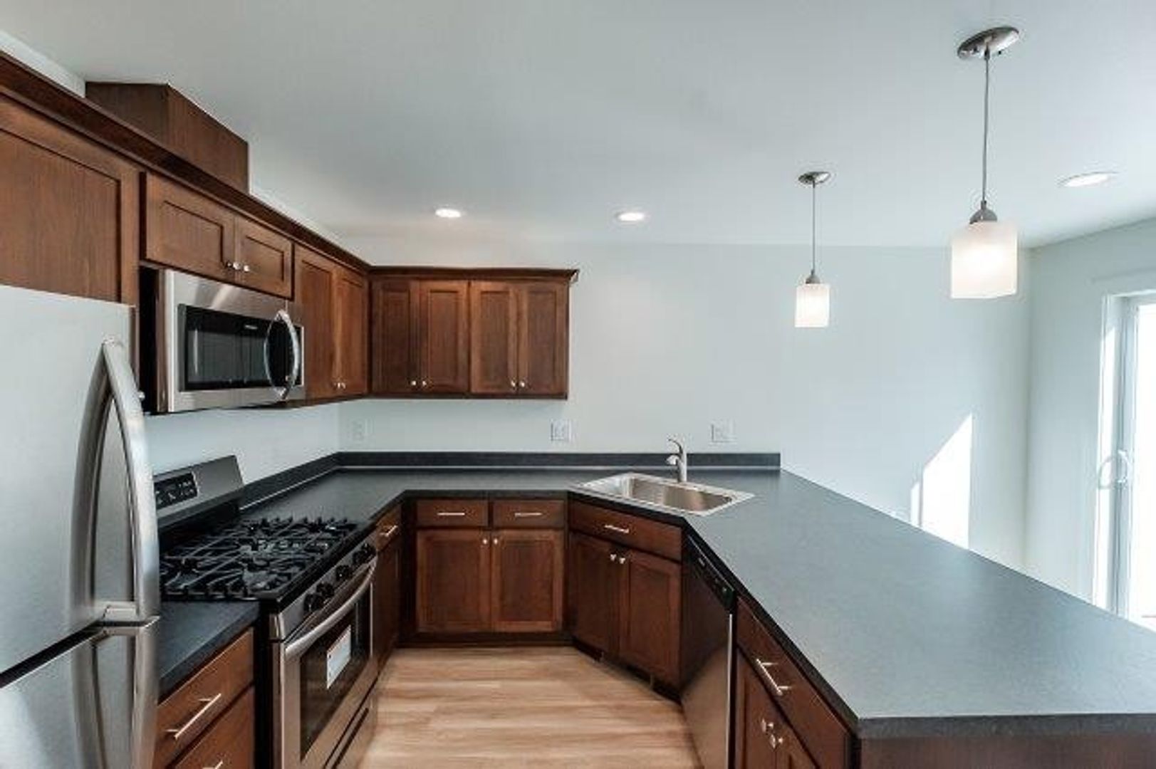 This two-story modern townhome has a beautiful open kitchen with stainless steel appliances and a gas range. The main room features a shiplap accent wall with gas fireplace and barn wood mantle, as well as a sliding glass door to the outside patio. The townhome also includes a laundry area with washer and dryer hookups, a spacious closet, single car garage, and two built-in desks.