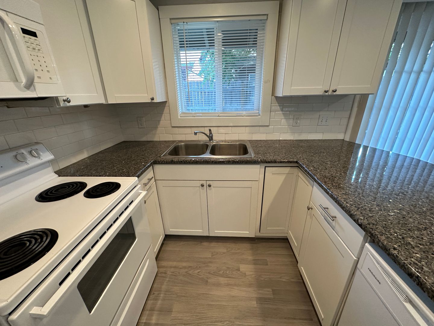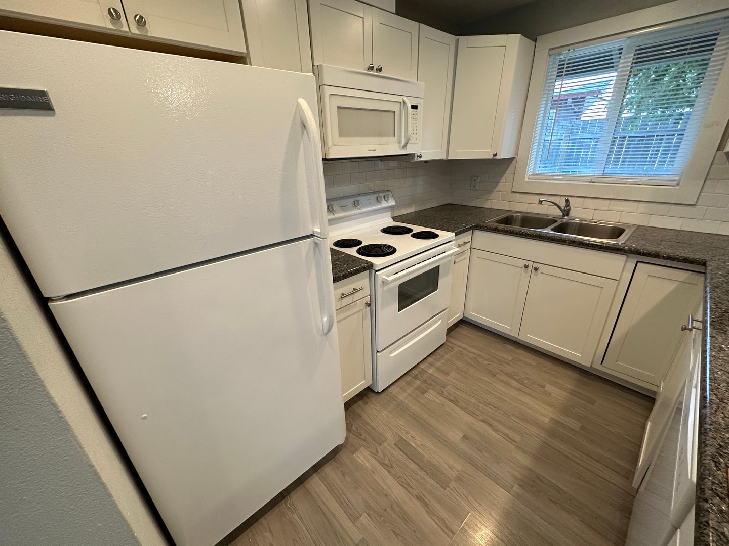 This updated unit has granite countertops! The kitchen has a refrigerator, stove/oven, dishwasher and microwave. There is also a dining area with a sliding glass door leading to the covered patio and fenced yard area. Other features include washer/dryer hookups, mini-split heating/cooling, cadet wall heaters and a storage closet in the hall. There is also off street parking for one vehicle included.