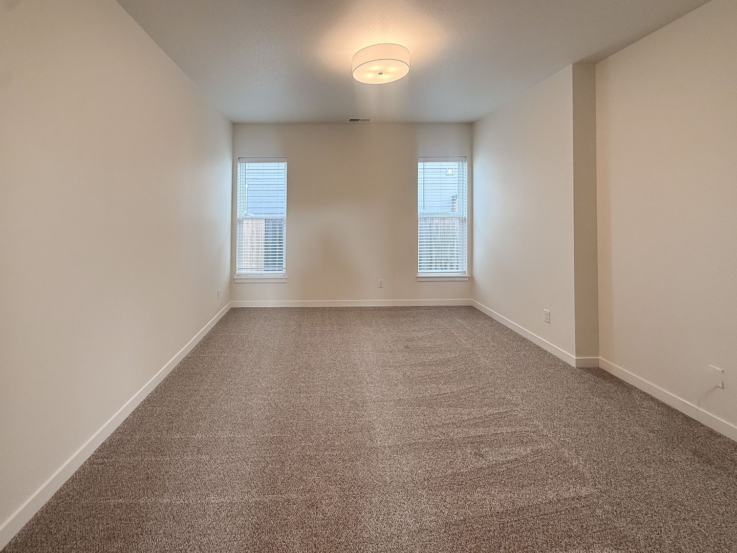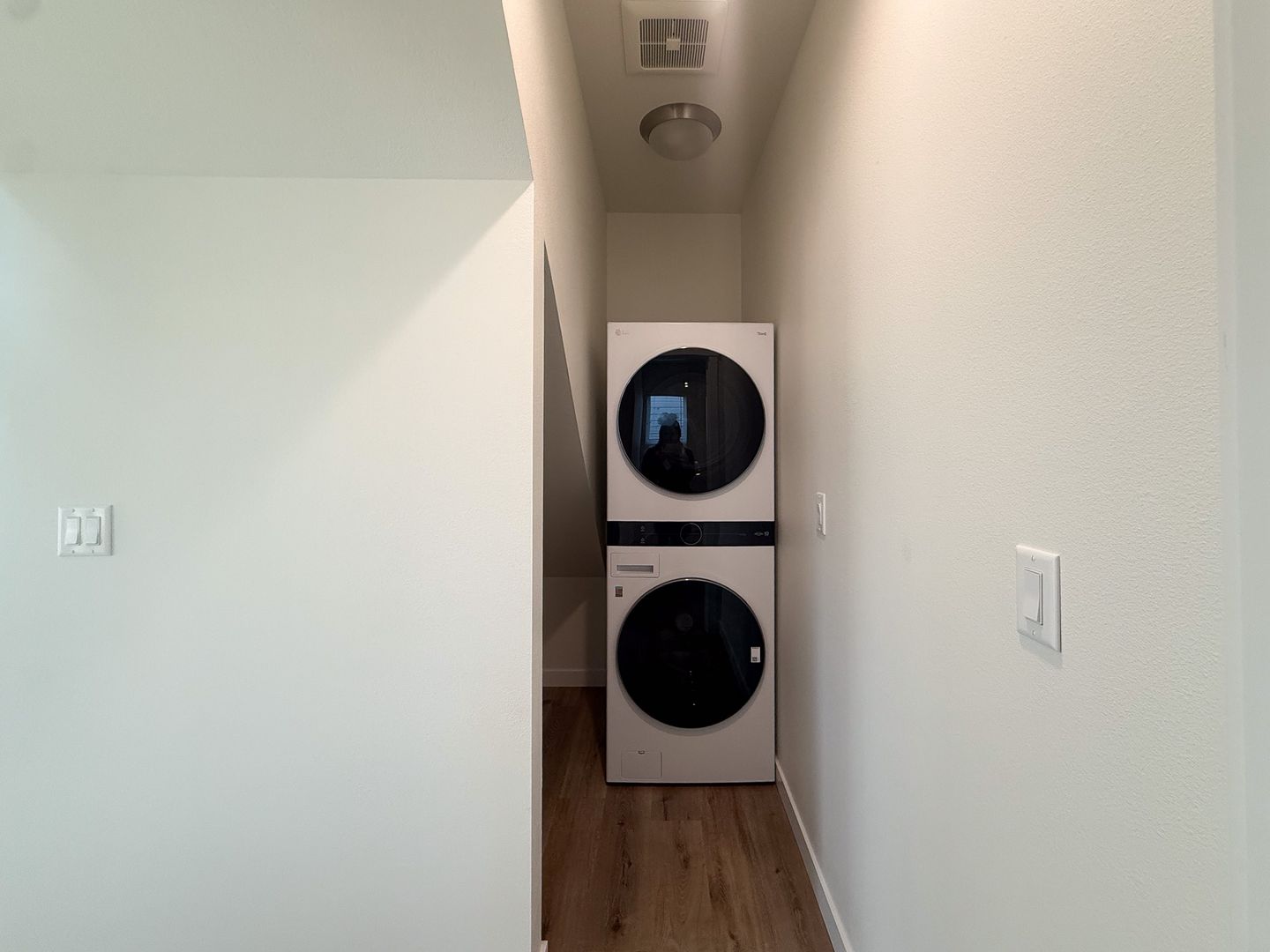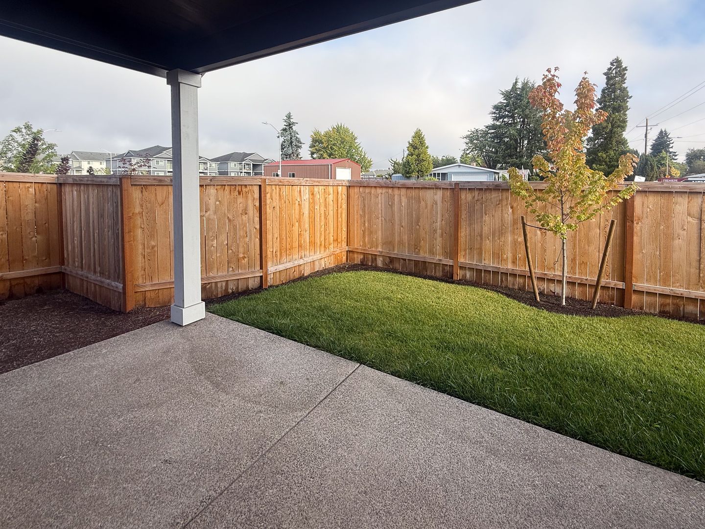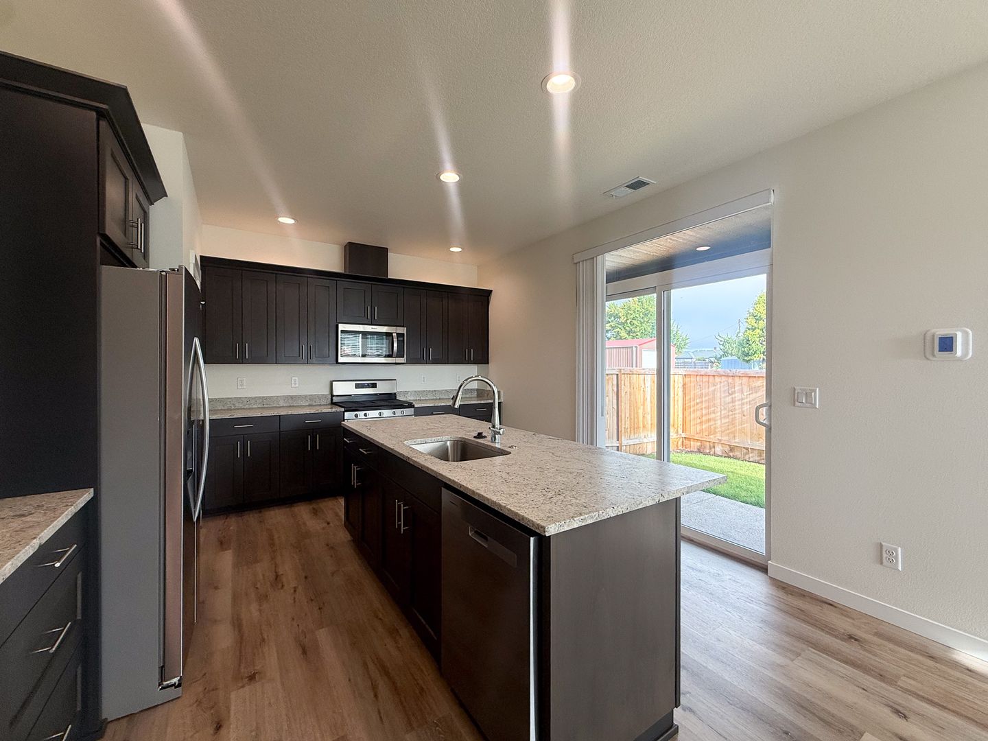 Be the first to live in this home! This home features a bright living area with large windows that offer a lovely view of the covered patio and a spacious, fenced backyard. The kitchen is equipped with modern appliances, including a refrigerator, stove/oven, dishwasher, and microwave, and it opens to a convenient dining area. Additionally, the main floor includes the laundry area (washer/dryer included), and the primary bedroom with a full bathroom that includes double sinks.