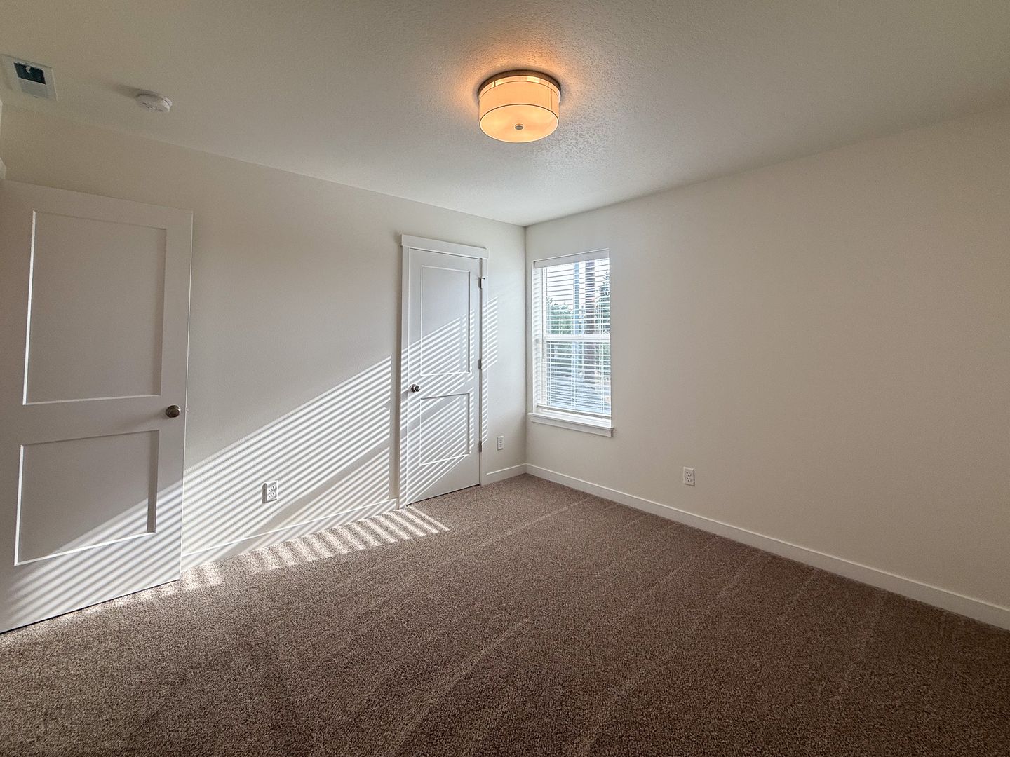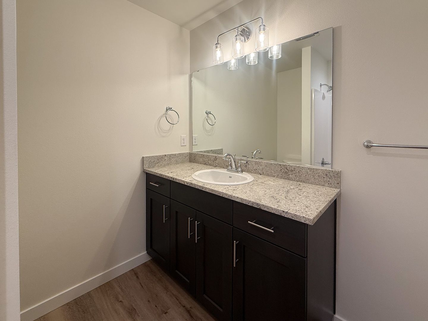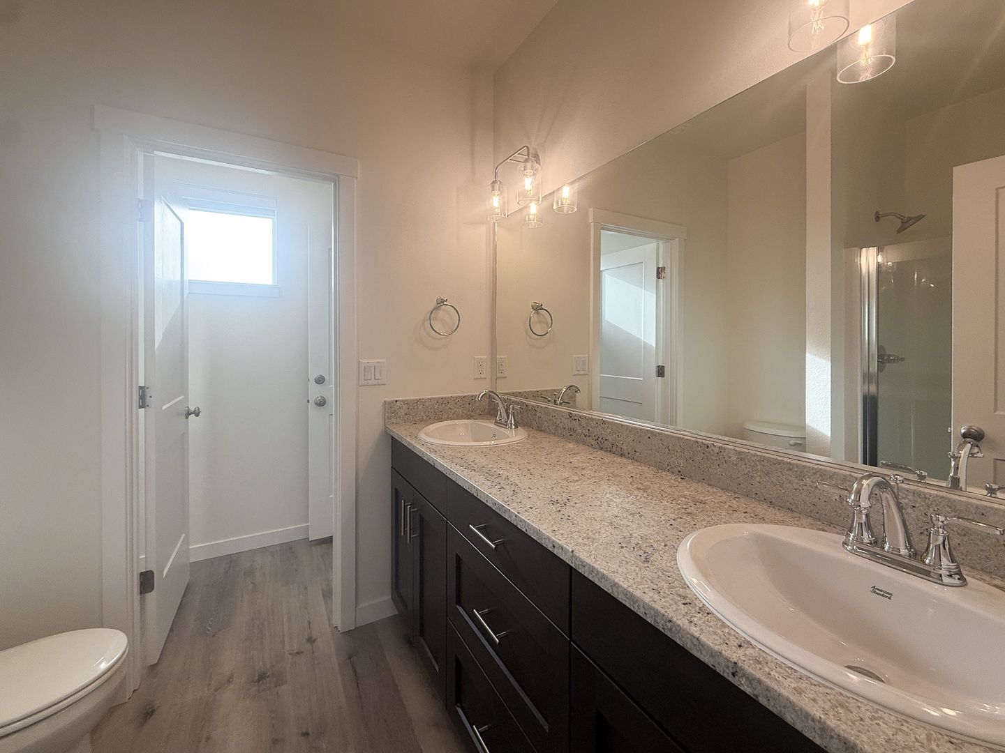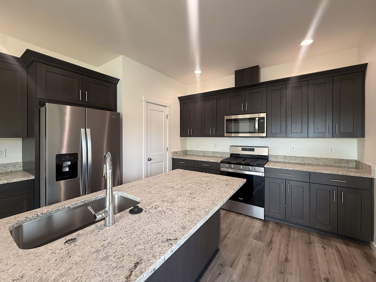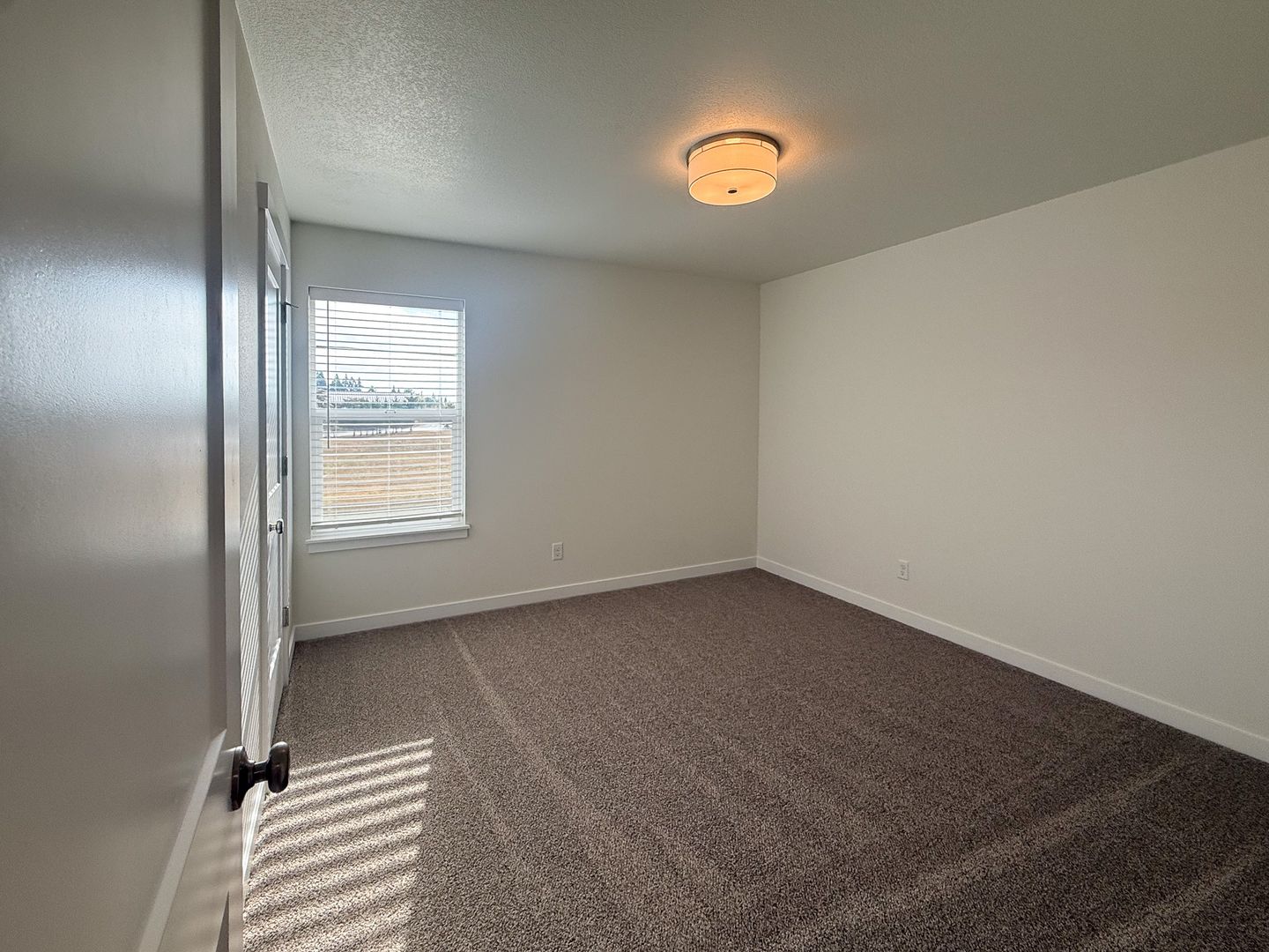 Be the first to live in this home! This home features a bright living area with large windows that offer a lovely view of the covered patio and a spacious, fenced backyard. The kitchen is equipped with modern appliances, including a refrigerator, stove/oven, dishwasher, and microwave, and it opens to a convenient dining area. Additionally, the main floor includes the laundry area (washer/dryer included), and the primary bedroom with a full bathroom that includes double sinks.