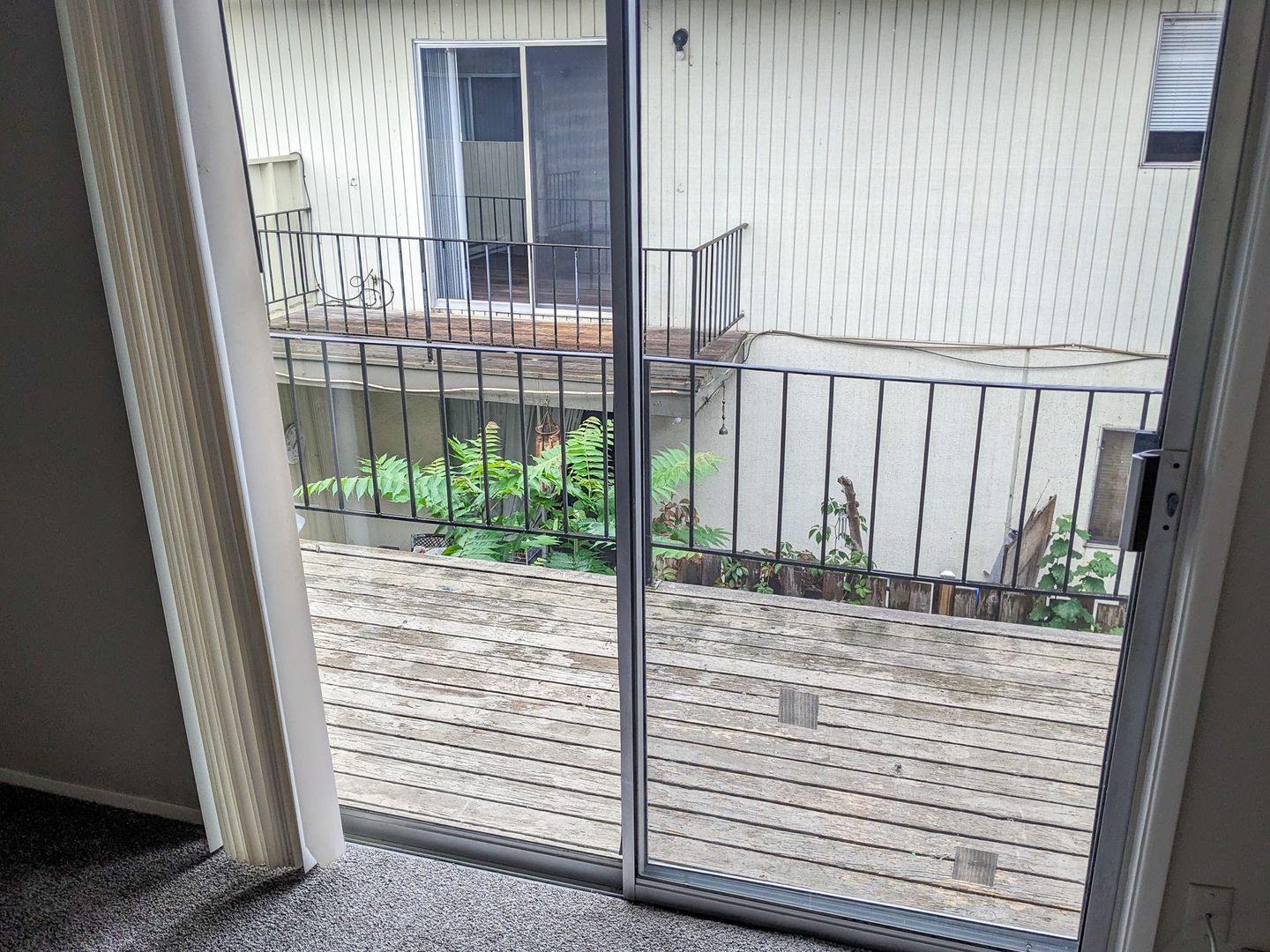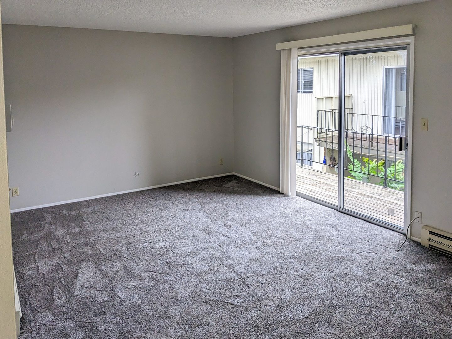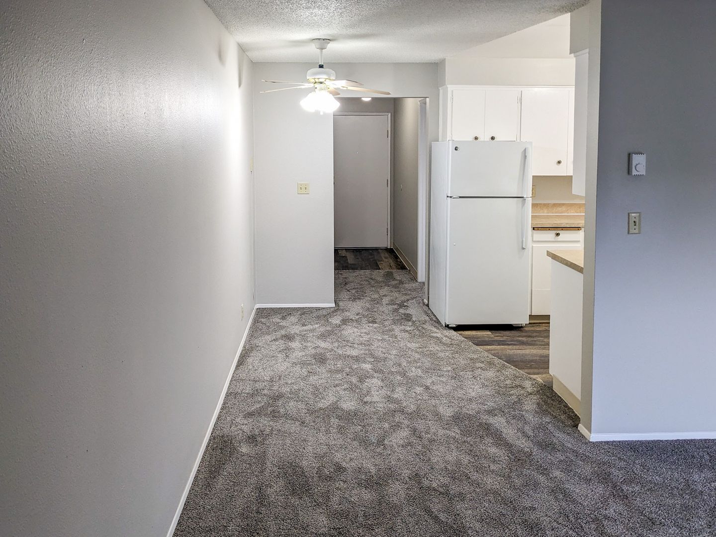 This upstairs unit features a spacious living room, and a sliding glass door to the fenced patio/balcony. The kitchen has a stove/oven, double sink and refrigerator. There is a ceiling fan in the dining area. Other features include off-street parking for one vehicle and an on-site laundry room.