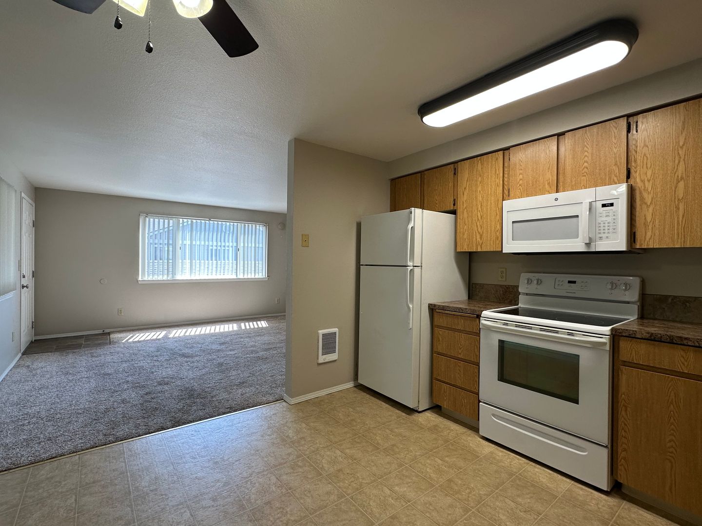 The kitchen includes a refrigerator, microwave, dishwasher and stove/oven. The unit also features cadet wall heaters, ceiling fan, vinyl windows, washer/dryer hookups, on-site laundry room, on-site fitness room, assigned parking and off-street parking.