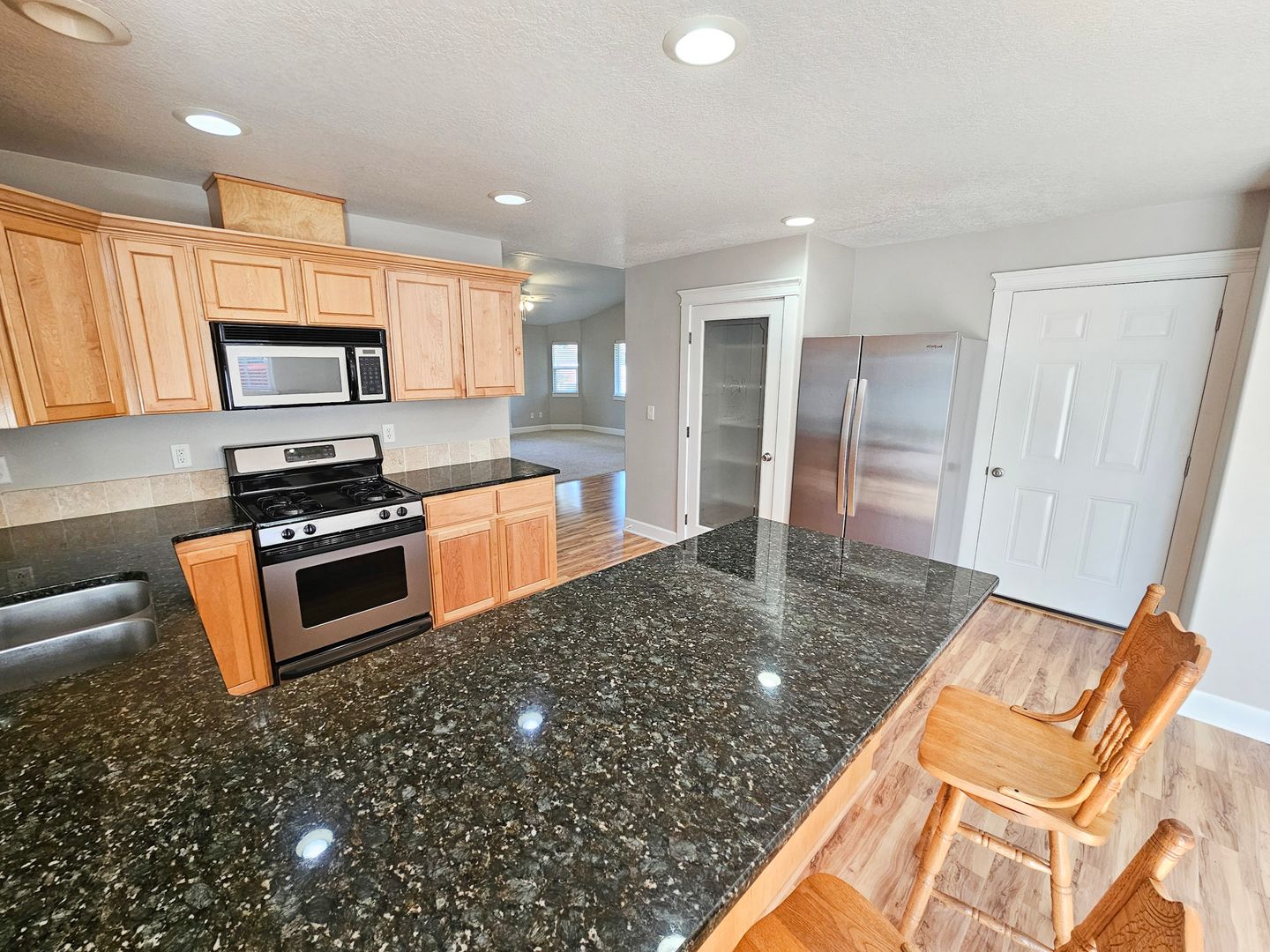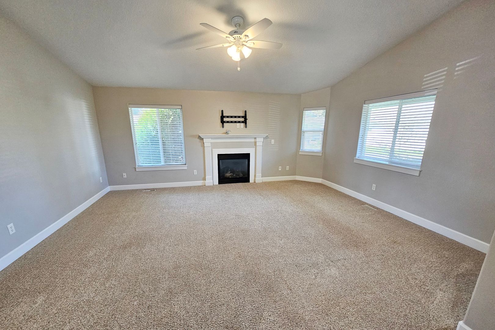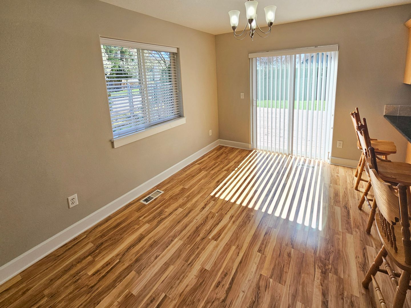 This single-level Woodburn home features a cozy living space with a gas fireplace. The kitchen is equipped with granite countertops, a refrigerator, dishwasher, stove/oven, and microwave. The dining area includes a sliding glass door that leads to a fenced backyard. The primary bedroom offers vaulted ceilings, a ceiling fan, and a spacious closet.