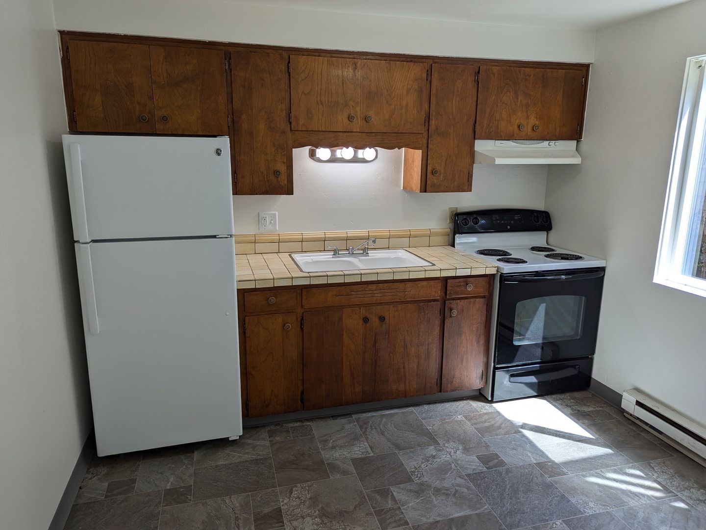 The kitchen features a refrigerator, a stove/oven, and a double sink. Additional amenities include electric baseboard heating, a spacious closet, extra storage, an on-site laundry facility, and a shared yard area. On-site parking for one vehicle is also included.