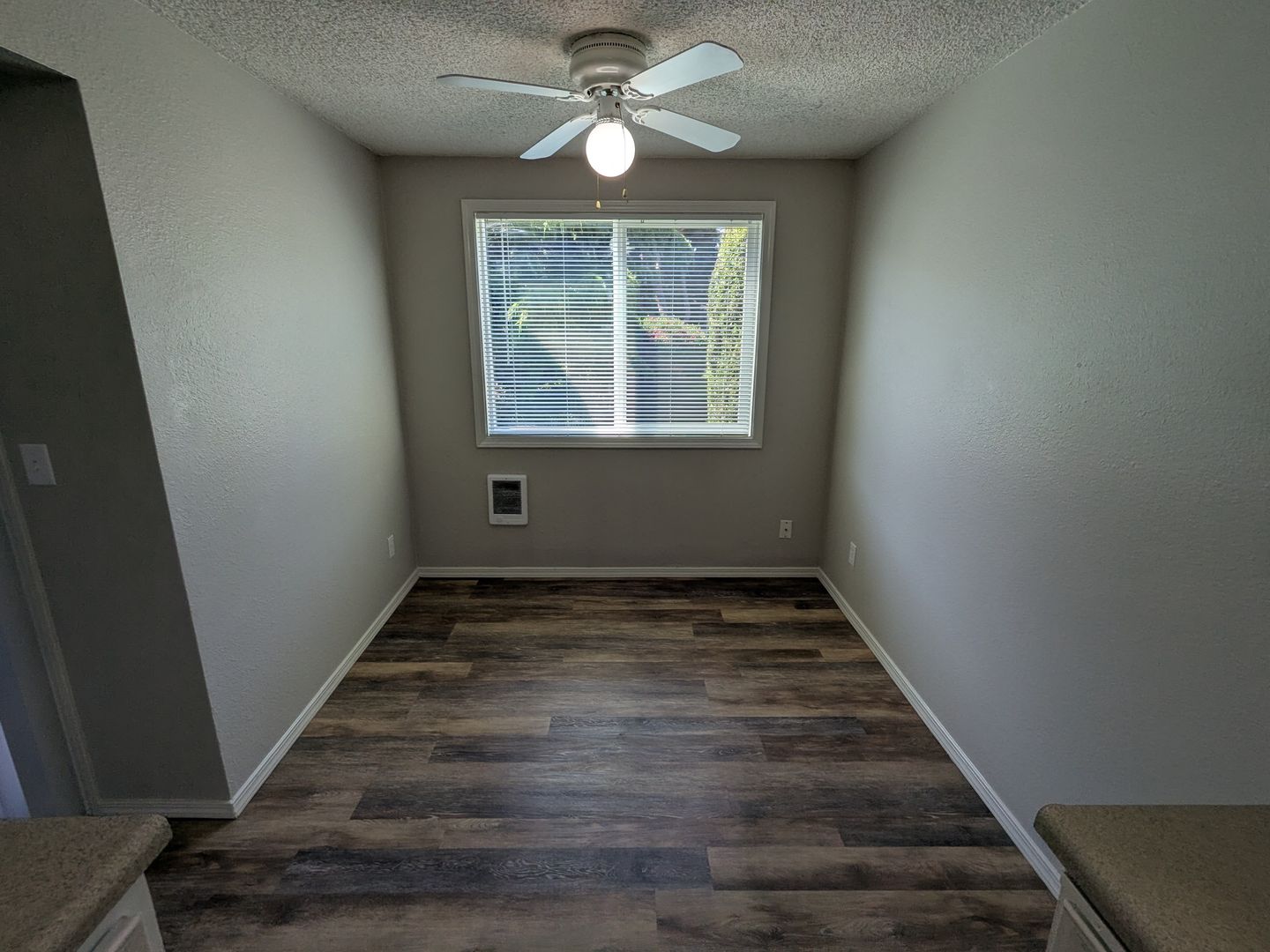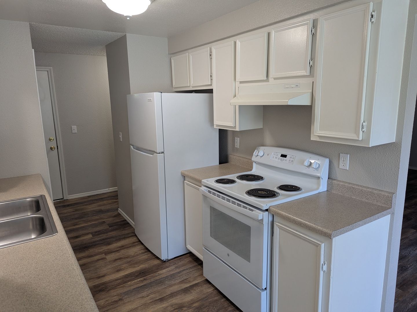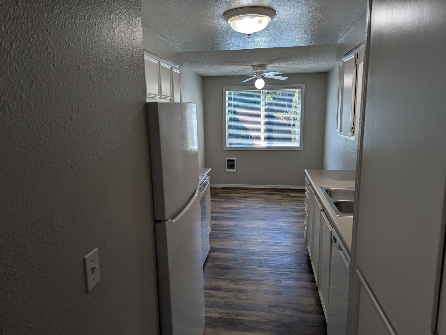 This galley style kitchen includes a dishwasher, stove/oven, and refrigerator. Other features include cadet heating, a dining area, and a sliding glass door to the covered back patio/balcony. The complex has off-street parking and 3 on-site laundry rooms.