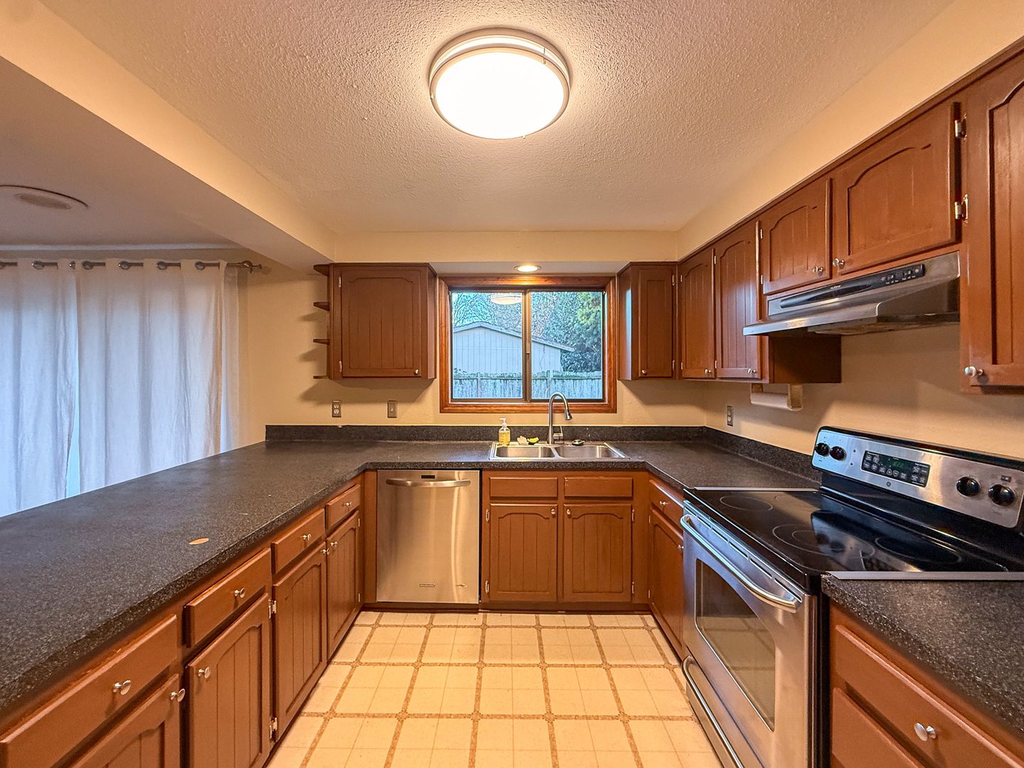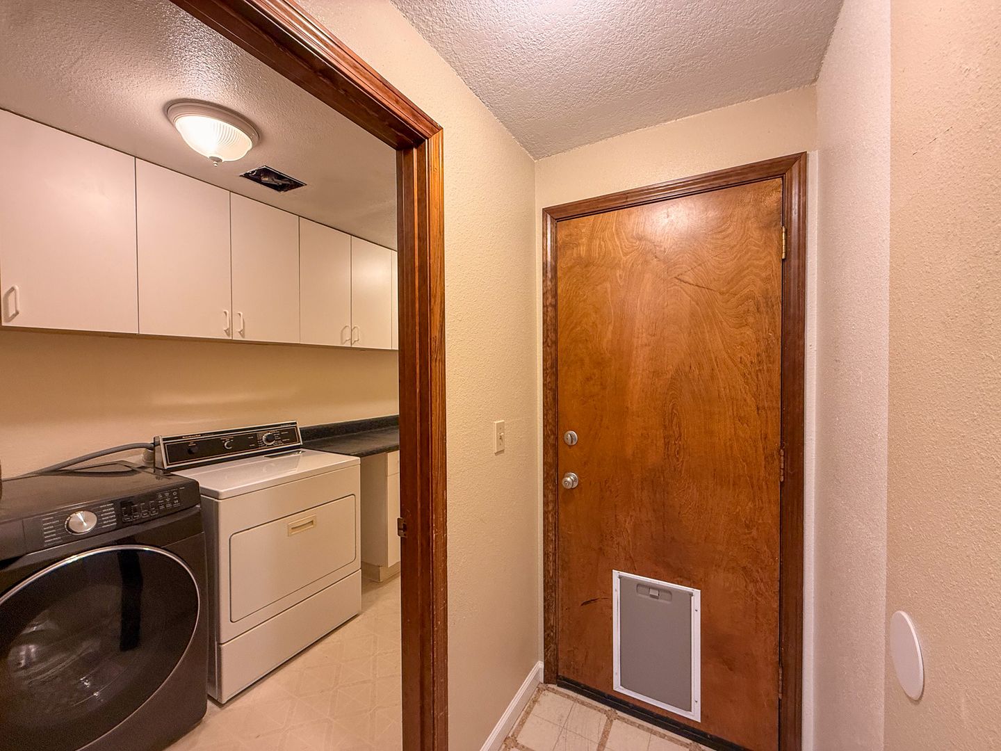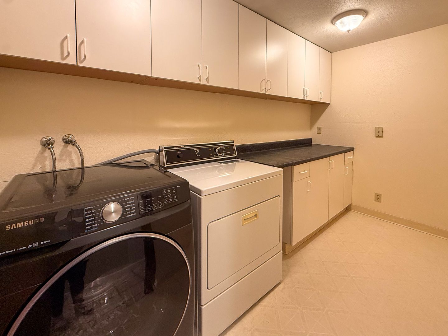 This spacious home features a kitchen equipped with stainless steel appliances, including a stove/oven, refrigerator, and dishwasher. The laundry room offers storage cabinets and a washer/dryer. Exterior features include a fully fenced backyard as well as an attached garage.