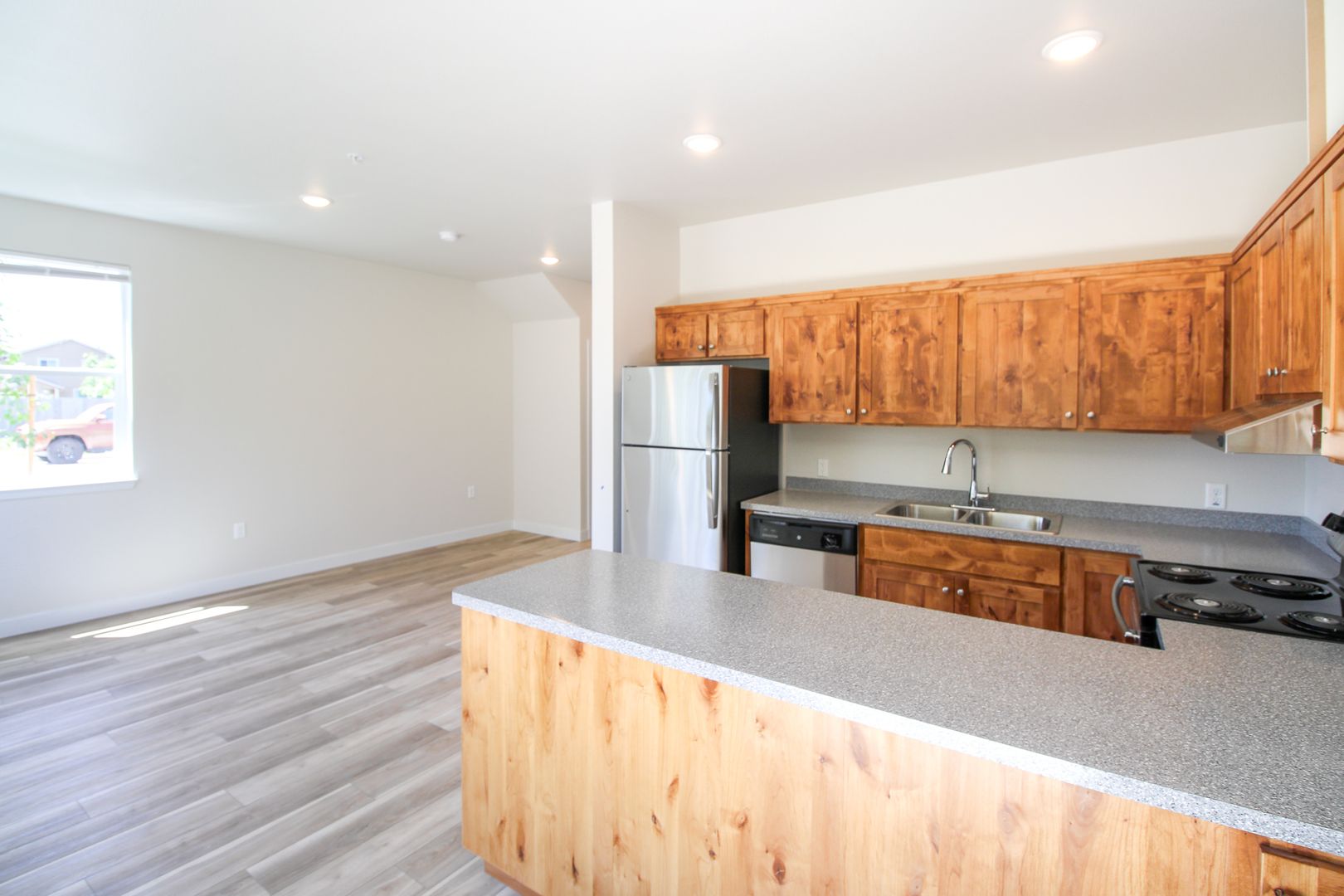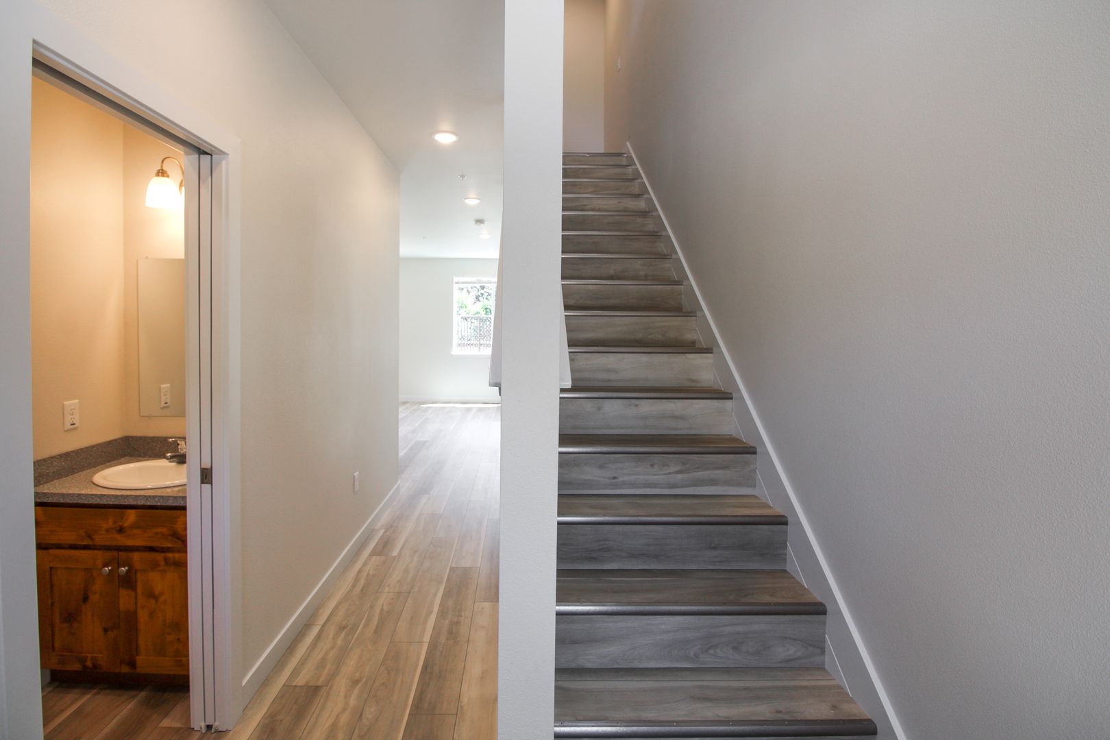 This three bedroom two and a half bathroom townhouse style unit features laminate flooring throughout. It has gas forced air heating and air conditioning, an attached one car garage and extra storage spaces. The living space, dining space, kitchen and half bath are downstairs. The kitchen features a dishwasher, refrigerator, stove/oven and double sink. There is a sliding glass door leading to the back patio. The three bedrooms, two bathrooms and washer/dryer are located upstairs. The primary bedroom includes a spacious closet and attached bathroom.