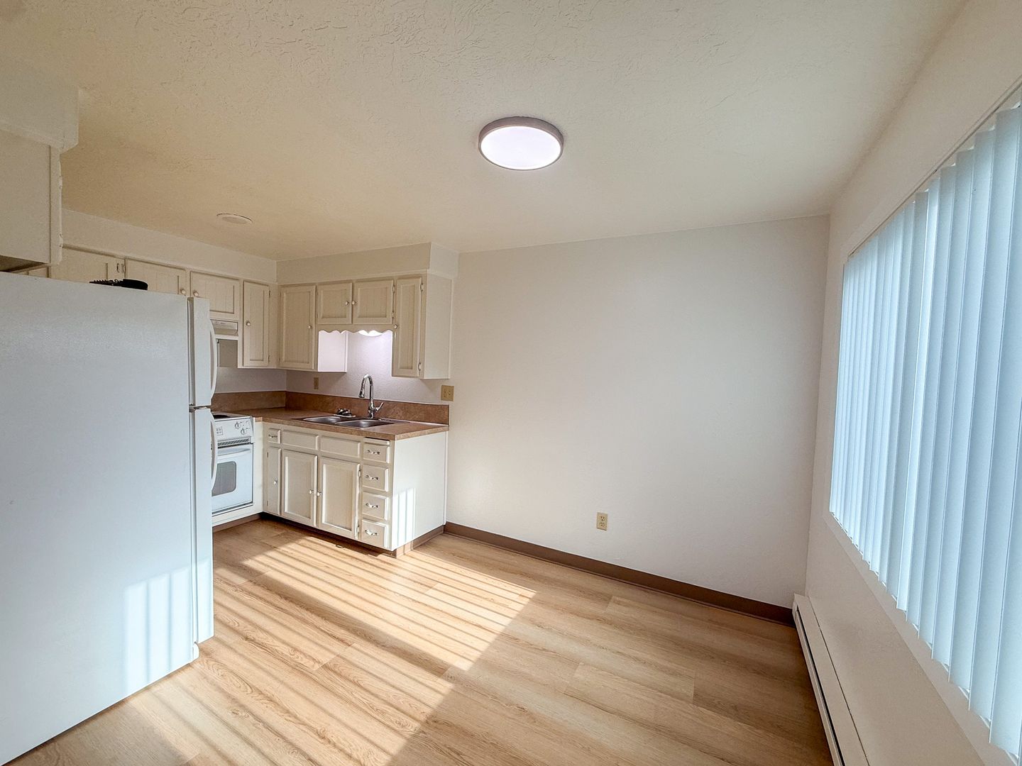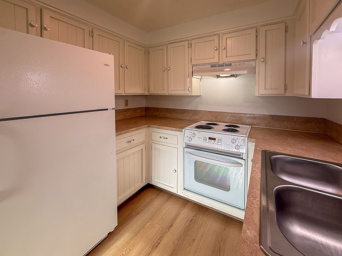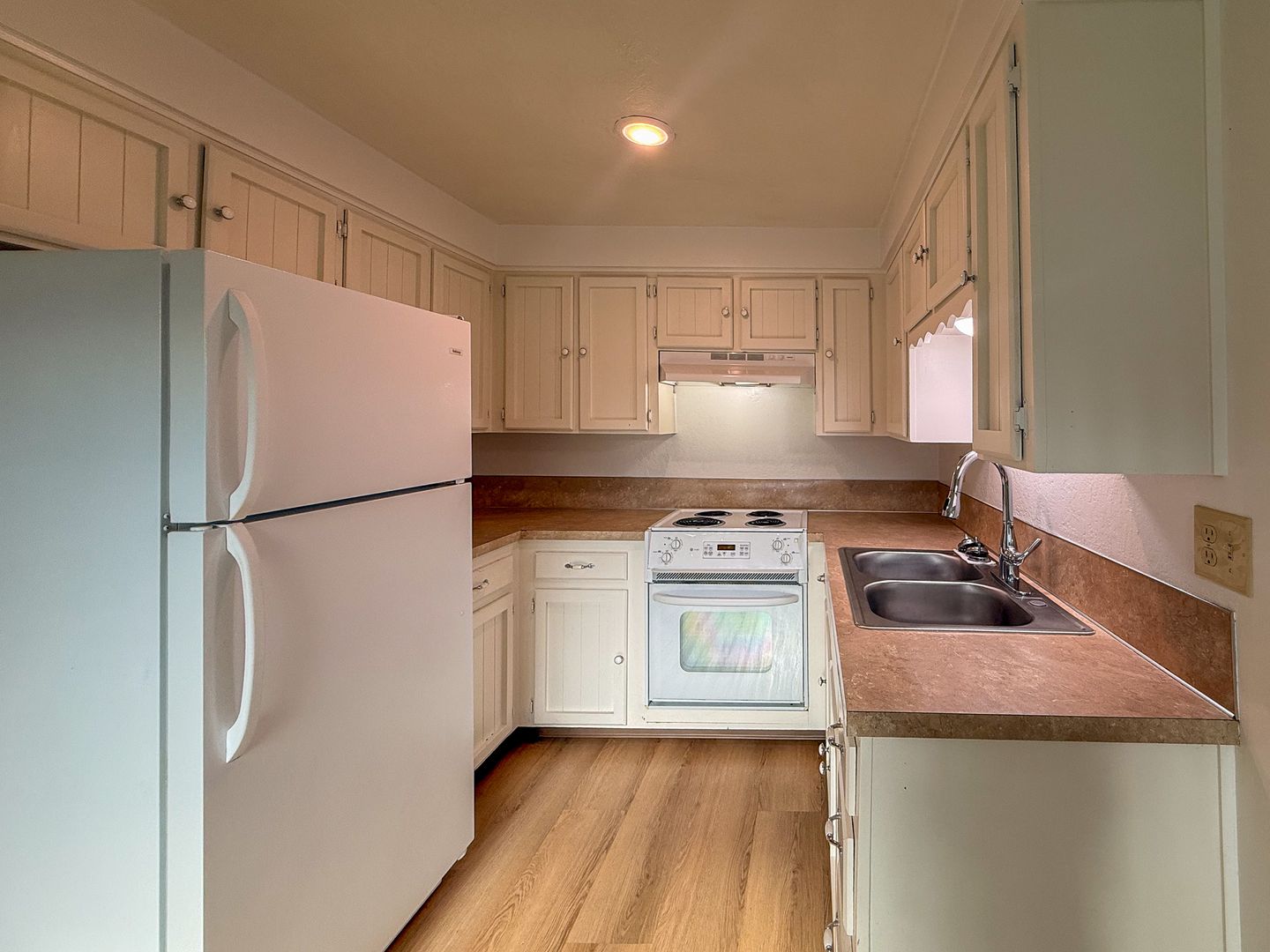 The kitchen in this townhome style unit includes a double sink, refrigerator and stove/oven. Other features also include washer/dryer hook-ups, fenced patio, and off street parking.