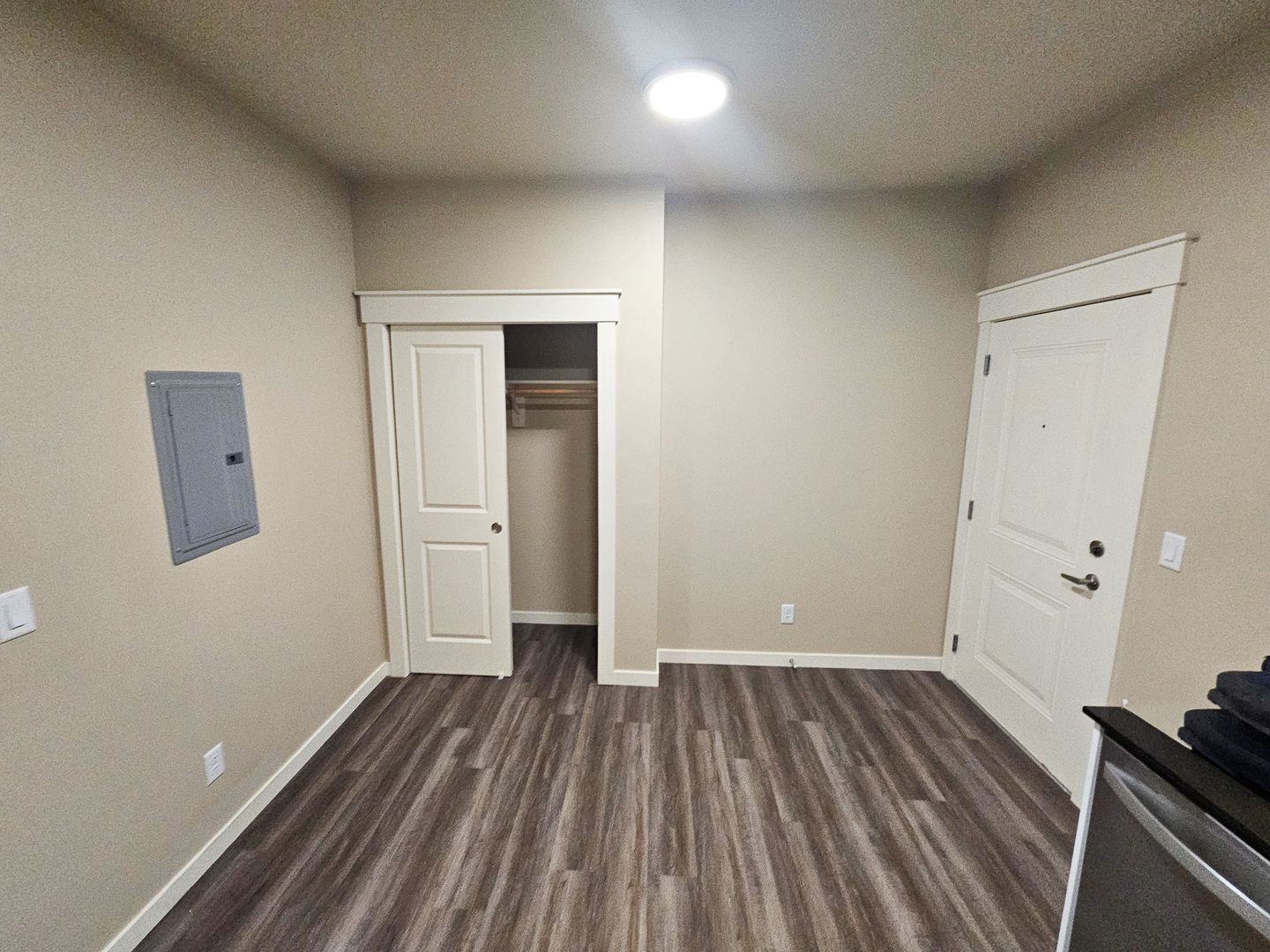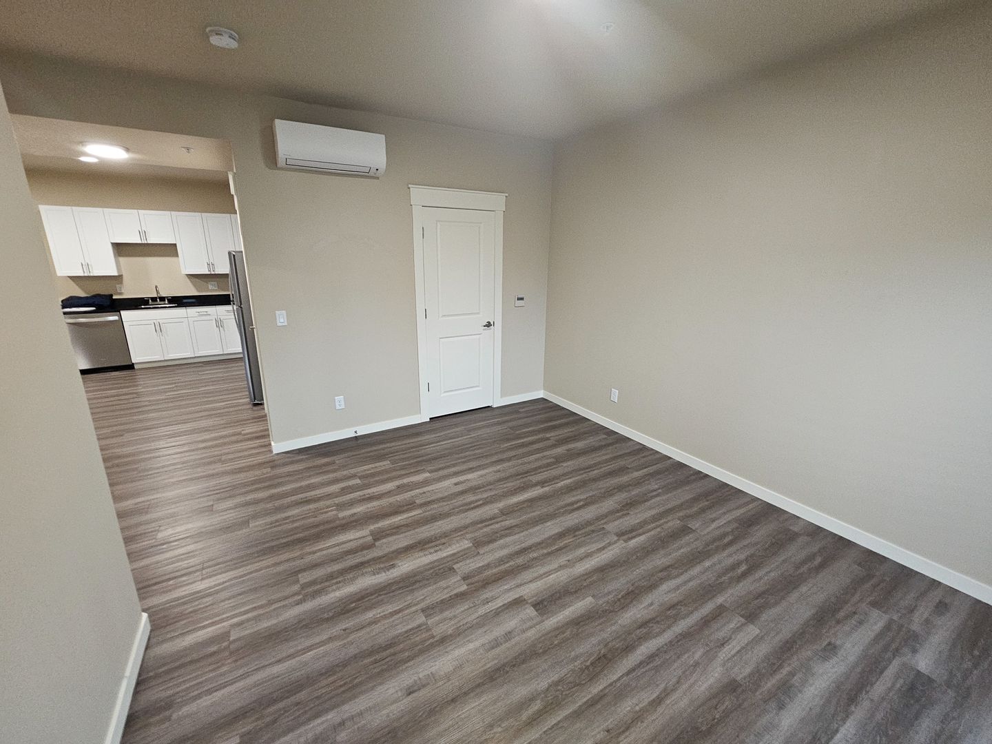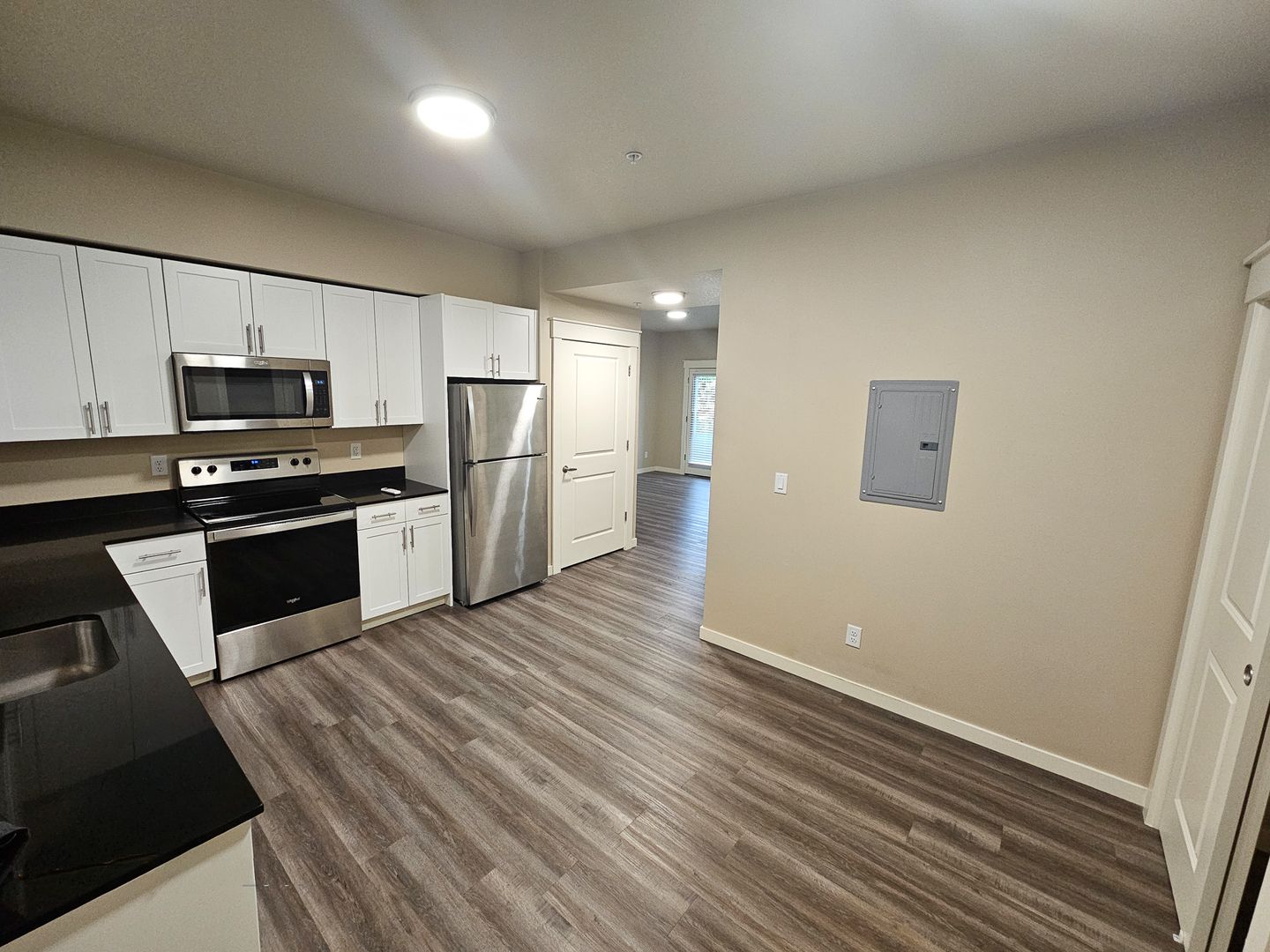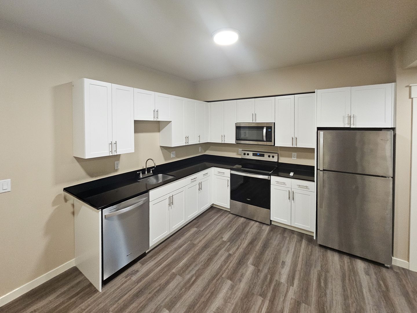 This third floor unit features a welcoming kitchen equipped with stainless steel appliances, including a refrigerator, stove/oven, dishwasher, and microwave. Throughout the apartment, you'll find beautiful finishes such as granite counters, sleek cabinetry, and hardwood-style plank floors. Additionally, our spacious floor plan offers great room living and dining, energy-efficient in-wall heating, and Energy Star-rated appliances. Each unit also includes a full-size stackable washer/dryer and a patio or deck to extend your living space outdoors.