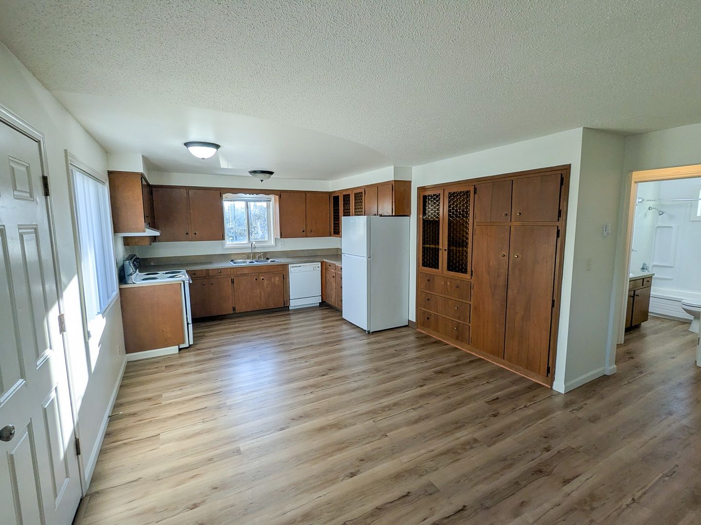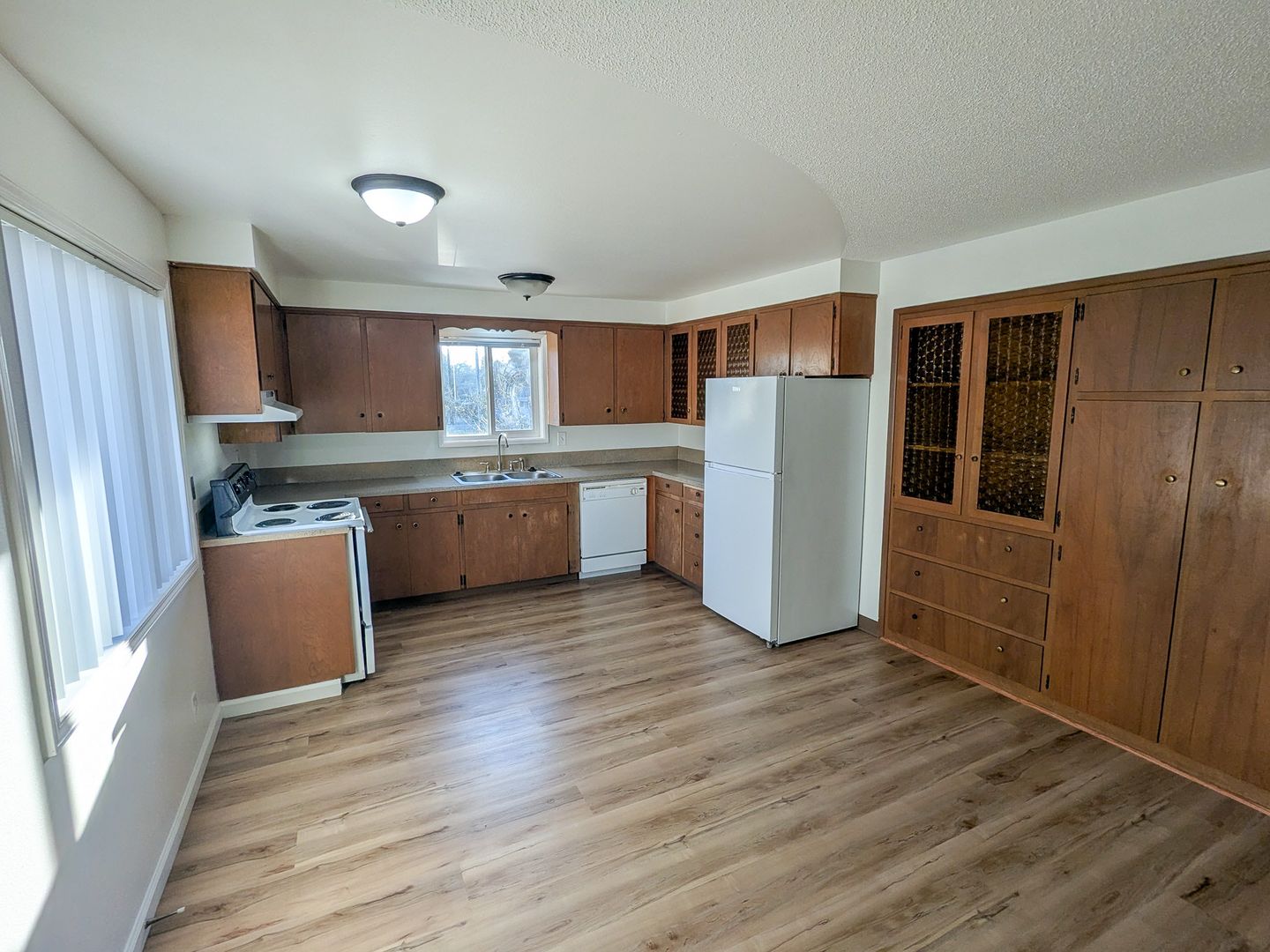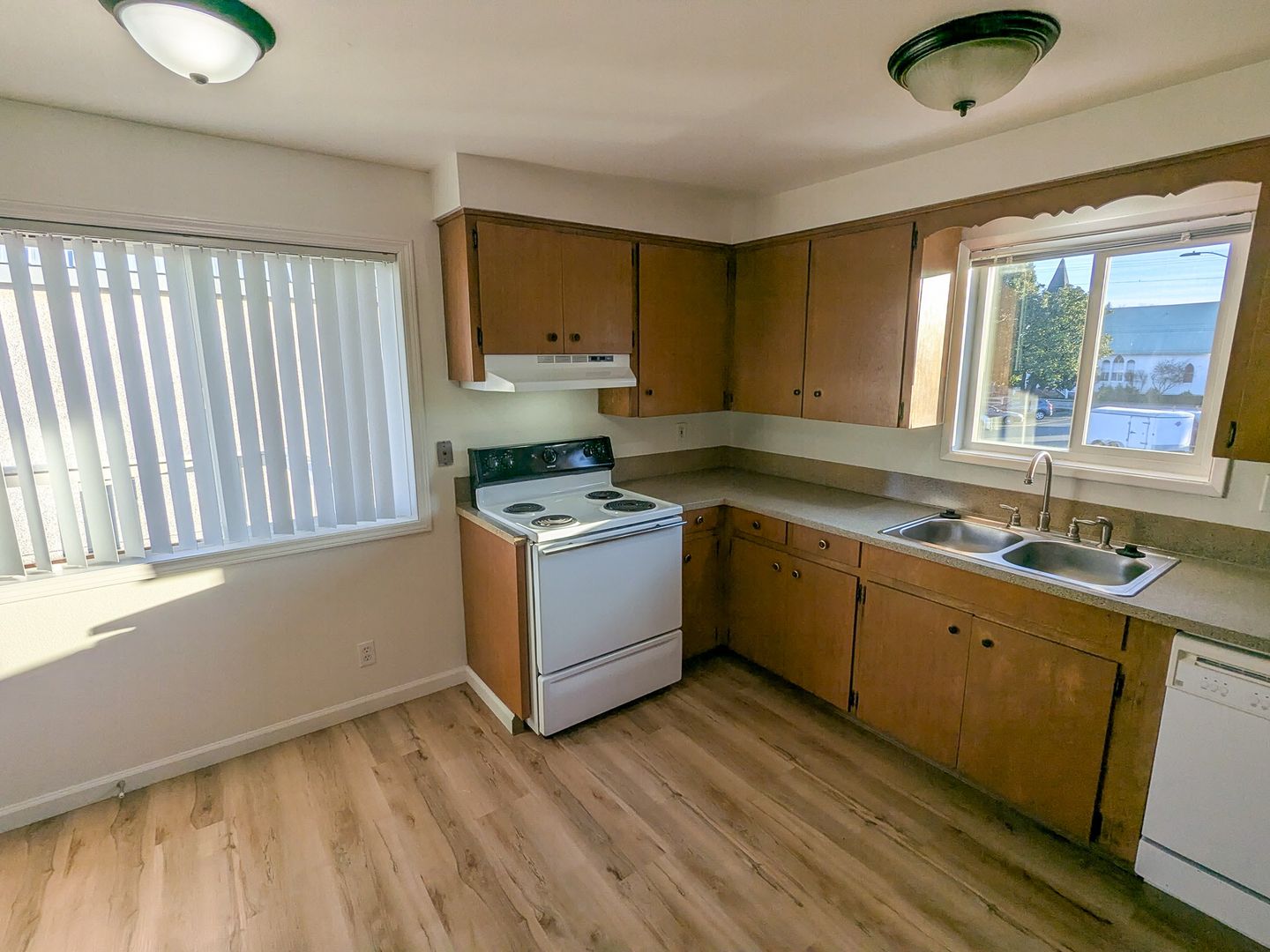 This upstairs unit features a kitchen that provides ample storage and is equipped with a refrigerator, dishwasher, double sink, and stove/oven. Additionally, the complex offers convenient onsite laundry facilities and off-street parking.
