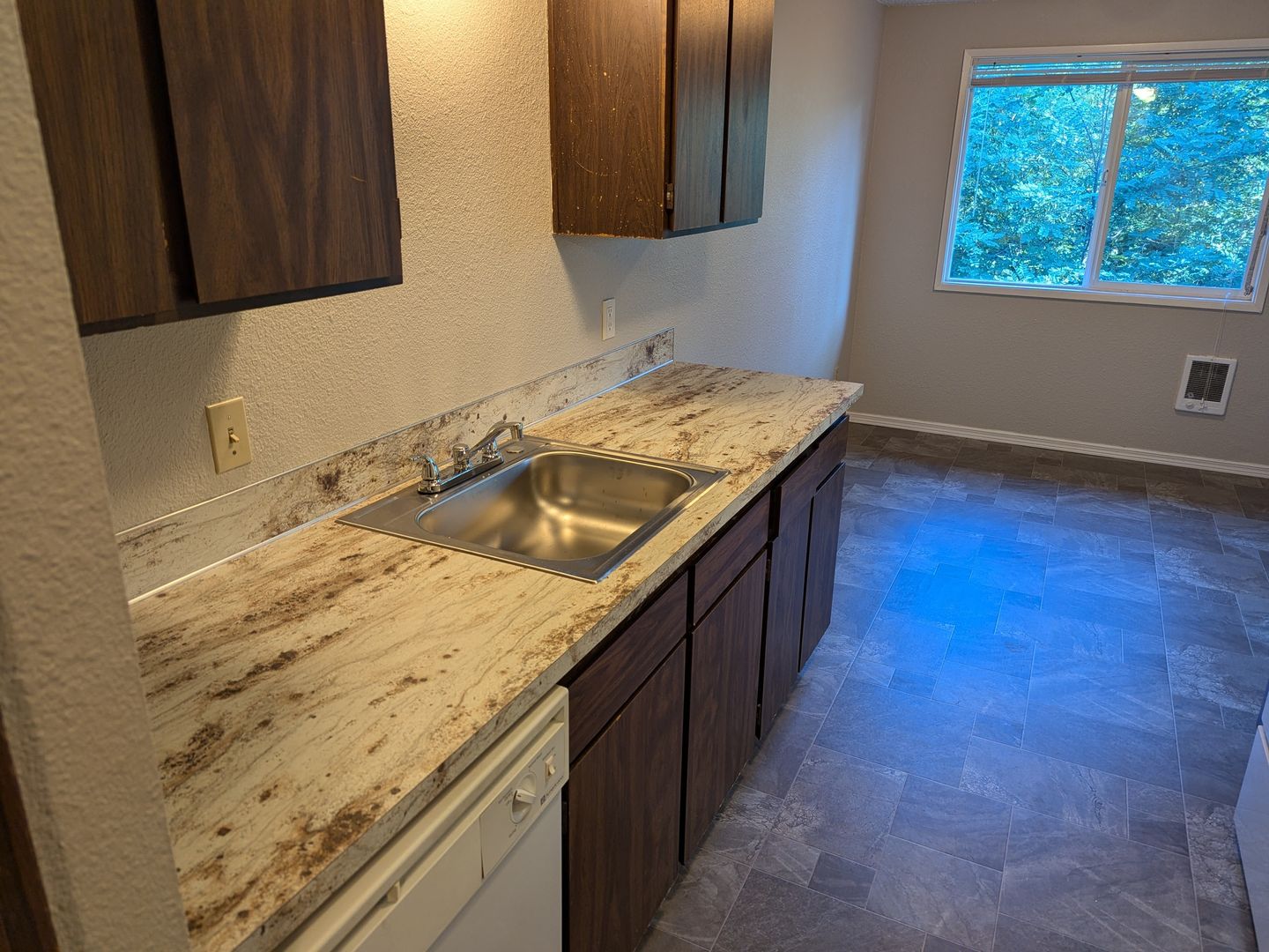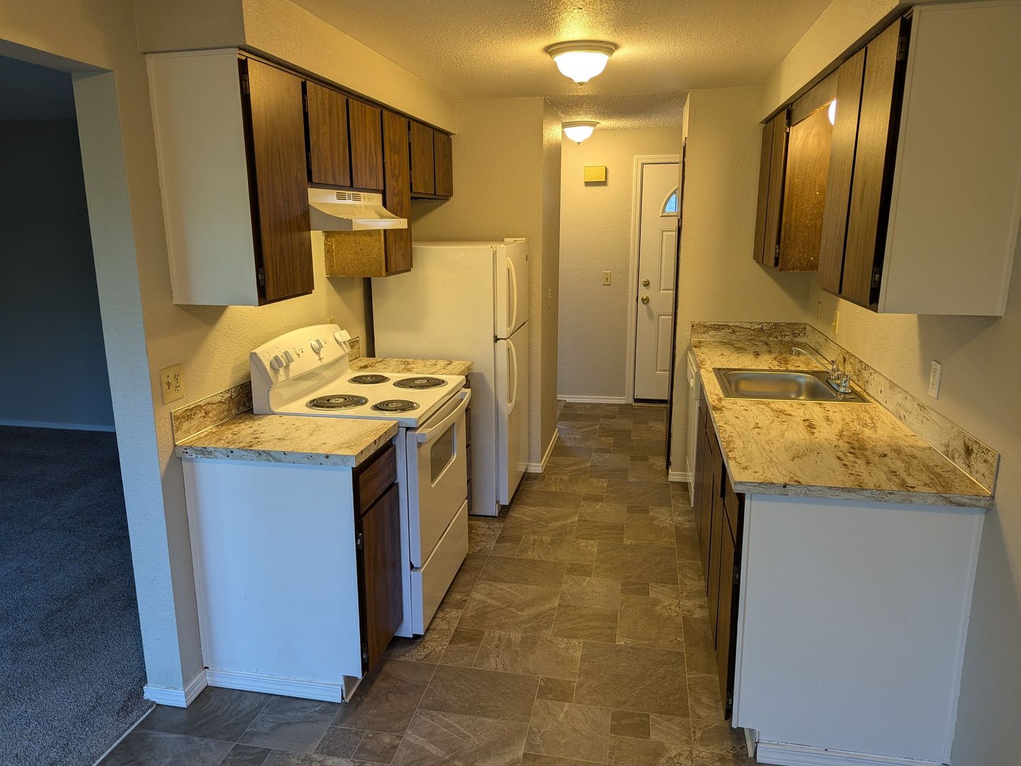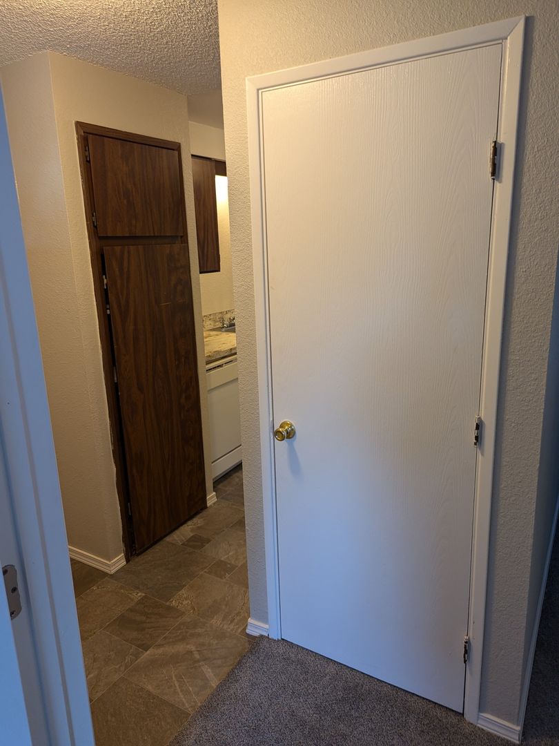The galley style kitchen includes a dishwasher, stove/oven, and refrigerator. Other features include cadet heating, a dining area, and a sliding glass door to the back balcony. The complex has off-street parking and 3 on-site laundry rooms.