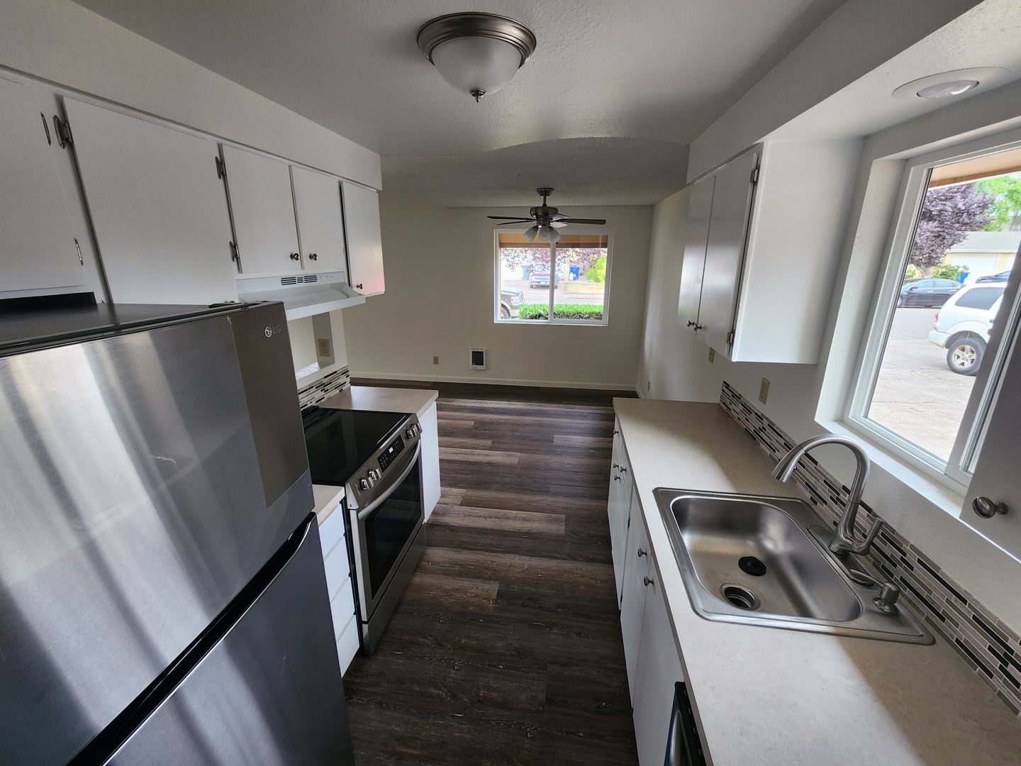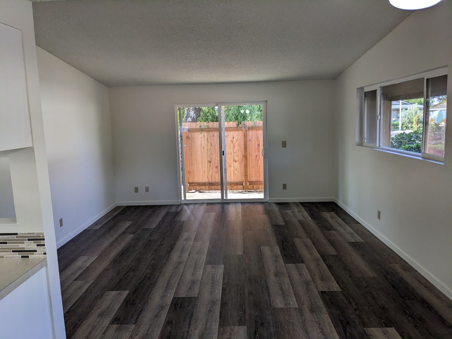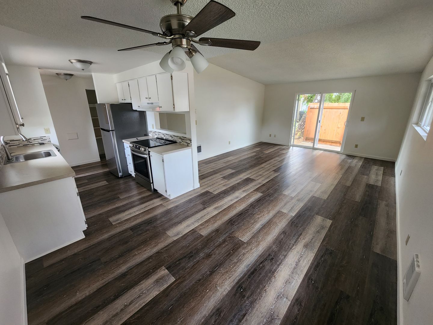 This well-appointed unit features a fully equipped kitchen with a stove, oven, dishwasher, and refrigerator. The living area includes a ceiling fan in the dining space and sliding glass doors that lead to a back area. Modern conveniences include efficient cadet heaters, in-unit washer/dryer hookups, and a single-car garage.