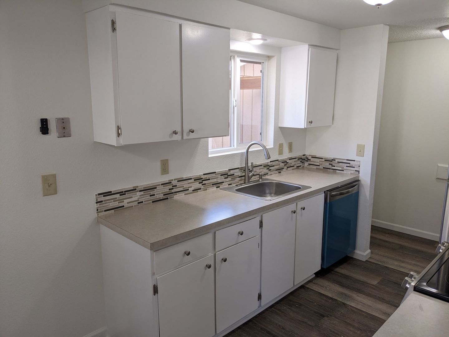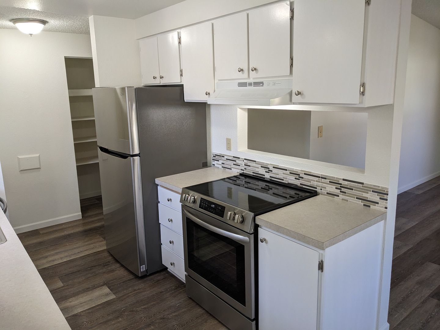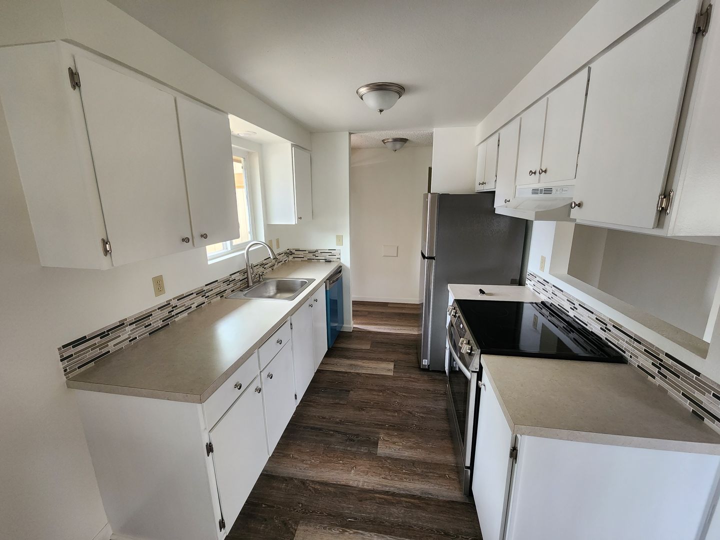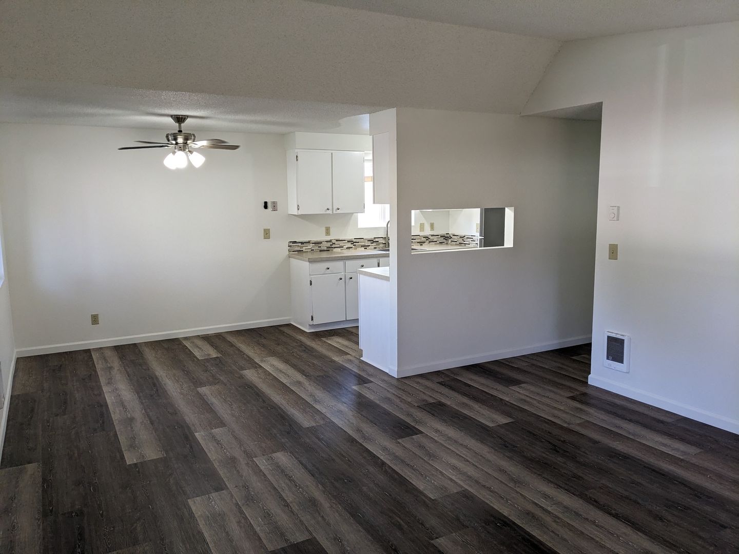 This well-appointed unit features a fully equipped kitchen with a stove, oven, dishwasher, and refrigerator. The living area includes a ceiling fan in the dining space and sliding glass doors that lead to a back area. Modern conveniences include efficient cadet heaters, in-unit washer/dryer hookups, and a single-car garage.