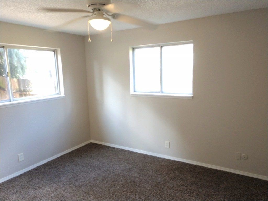 The kitchen in this apartment includes a stove/oven, refrigerator, dishwasher, and double sink. The sliding glass door in the dining area leads to the back cement patio. The apartment also includes ceiling fans in the bedrooms and dining area and laminate throughout the kitchen, dining, and living areas. There is an onsite laundry room for tenant use.